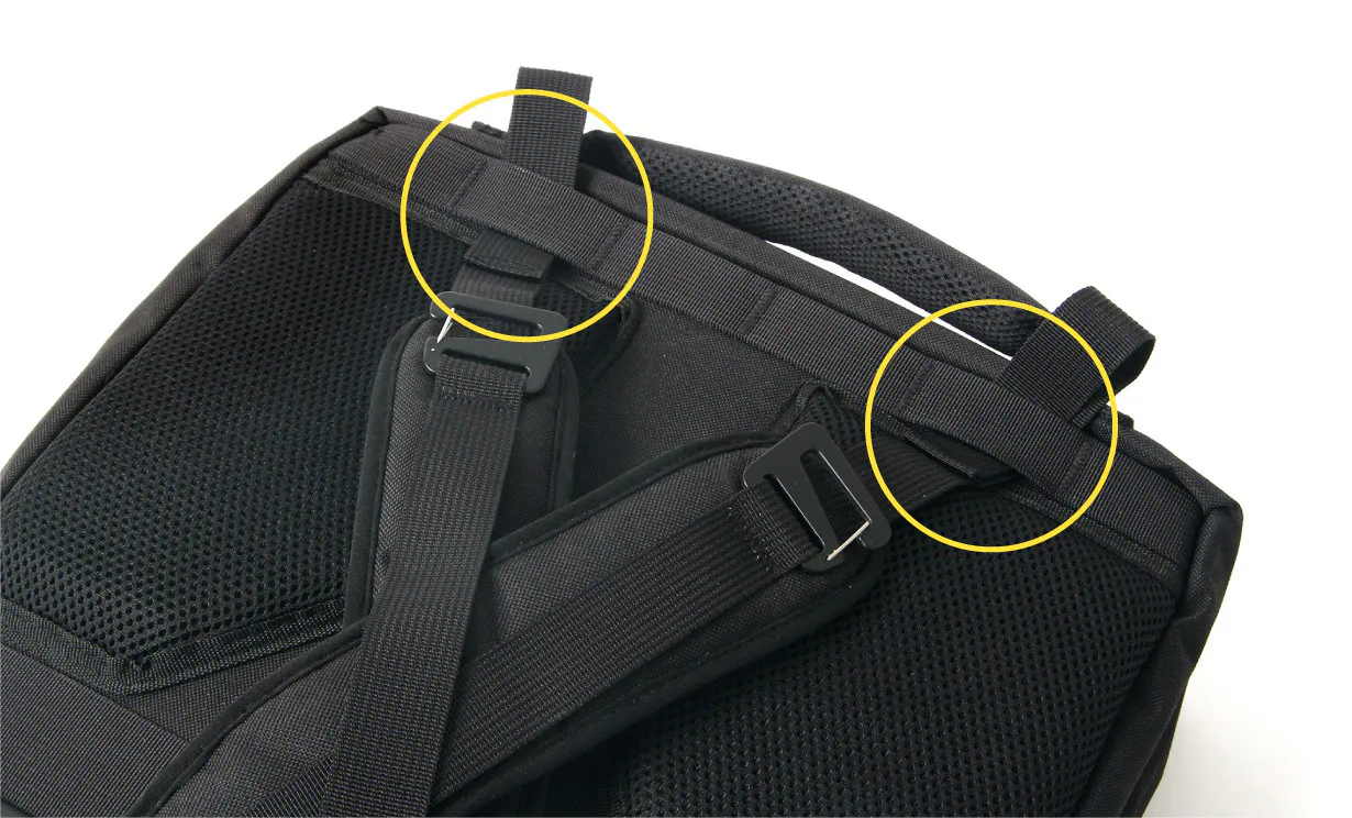 FIXPACストラップの場合、ストラップの力が体の中心に向かうため、ずり落ちないように肩に力を入れる必要がなく、ずり落ち防止のためのチェストストラップ(ストラップ留め)も不要です。