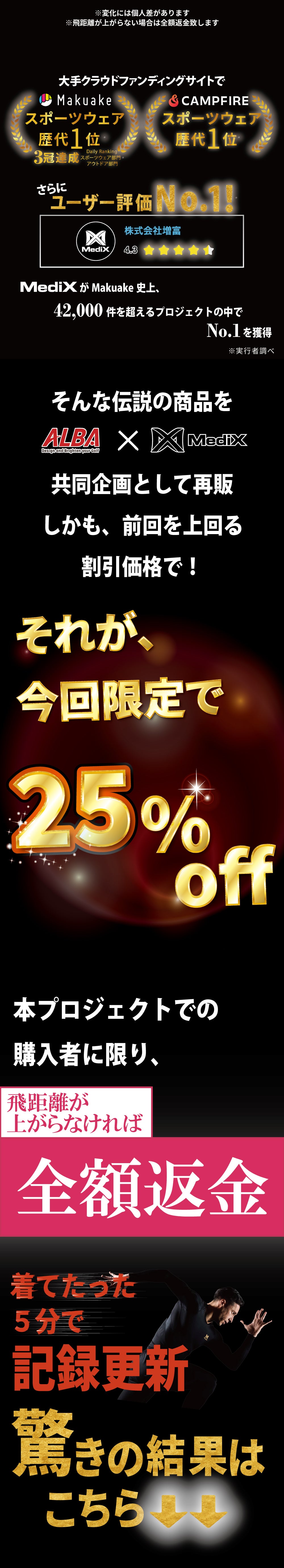 2025/06/30 00:00プロジェクトを応援してくださった皆様、本当にありがとうございました!スタッフ一同、感謝の気持ちでいっぱいです!今回は、なんとあの日本最大級のゴルフメディア「ALBA」さんよりお声をかけていただきコラボが実現!「ALBA」様の記事やライブ配信は見ていただけましたか?皆様からの温かいコメントに、私たちもたくさんのパワーをいただきました。前回と同じ商品にもかかわらず、目標を大きく超えるご支援をいただけたことに、驚きと喜びで胸がいっぱいです!これも全て、応援してくださった皆さんのおかげです!【発送日について】商品は7月7日(月)以降、発送の準備ができ次第、順次発送をいたします。お手元に届くまで、もう少々お待ち下さい!【箱の中に、ちょっとした特典が…】感謝を伝えたくて、ささやかですが特典をご用意しました。何が入っているかは、お手元に届くまでのお楽しみとさせてください!【あらためて感謝を!】MediXは、これからも皆様のスポーツライフに革命をもたらすような商品を作り続けます。今後の私たちの挑戦にも、ぜひご期待ください!本当にありがとうございました! もっと見る