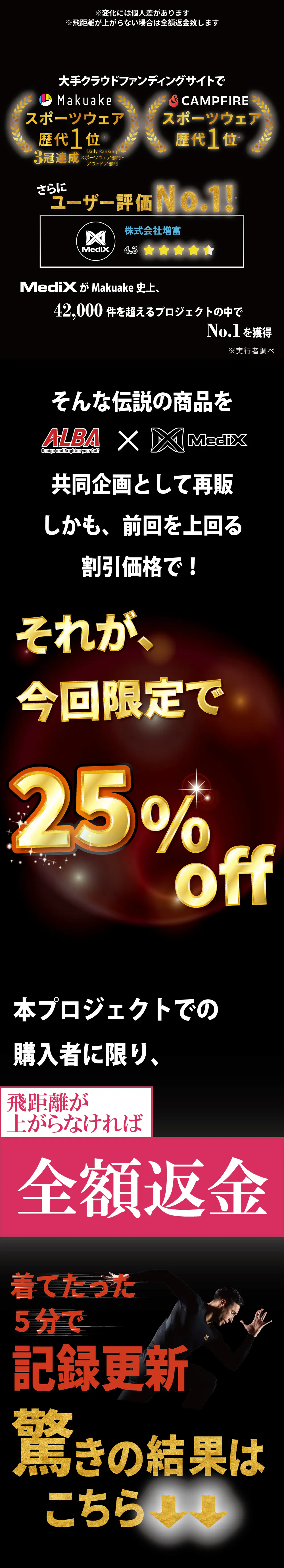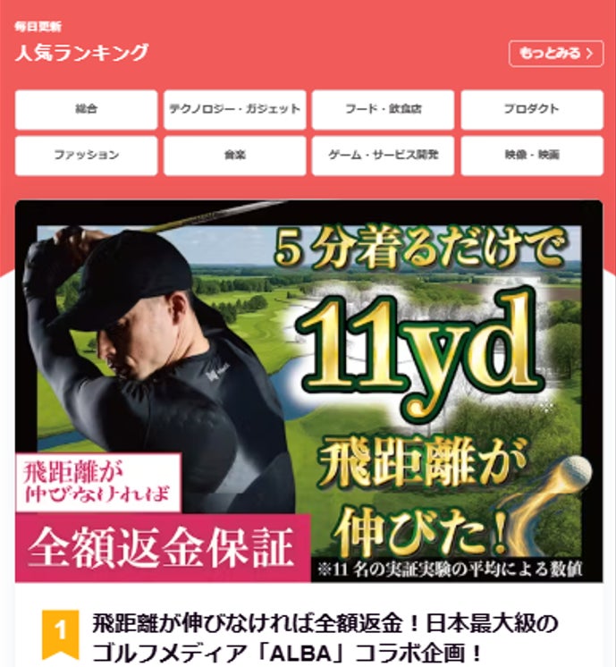 2025/06/02 17:00【あなたのゴルフが変わる!MediX × ALBAプロジェクトが人気No.1に!】私たちのオリジナルスポーツウェア「MediX」と、あの「ALBA」誌の特別コラボプロジェクトが、人気ランキング(総合)で1位を獲得しました!このウェア、ただものじゃありません。秘密は、ウェアにプリントされた「リライブ加工鉱石」。試してみたら…なんと、たった5分の着用で、平均11ヤードも飛距離がアップしたという、驚きの結果が出ています!【なぜ、こんなにも人気?】■「試してみたい!」が止まらない、魔法の数字■「5分で平均11ヤードUP」。この数字は、長年飛距離に悩んできたゴルファーにとって、まさに希望の光!「自分のゴルフも変わるかも?」そんなワクワクする期待感が、多くの方の心を掴みました。■ゴルフの”相棒”「ALBA」のお墨付き!■みんなが信頼するゴルフ情報誌「ALBA」とのコラボだから、安心感が違います。「ALBAが言うなら間違いない!」と、多くのゴルファー仲間が注目。その期待が、ランキング1位という大きな波になりました。【心からのありがとうと、これからのワクワクを!】私たちの想いに共感し、応援してくださったゴルフを愛する皆さん、いつも最新情報を届けてくれる「ALBA」読者の皆さん、そして「MediX」の力を信じてくれた全ての方々のおかげです。ありがとうございます!【まだ割引価格が残っています】「あの時、試しておけば…」なんて後悔はさせません!ぜひこの機会に、MediXと一緒に、まだ見ぬ最高のショットを体験しませんか? もっと見る