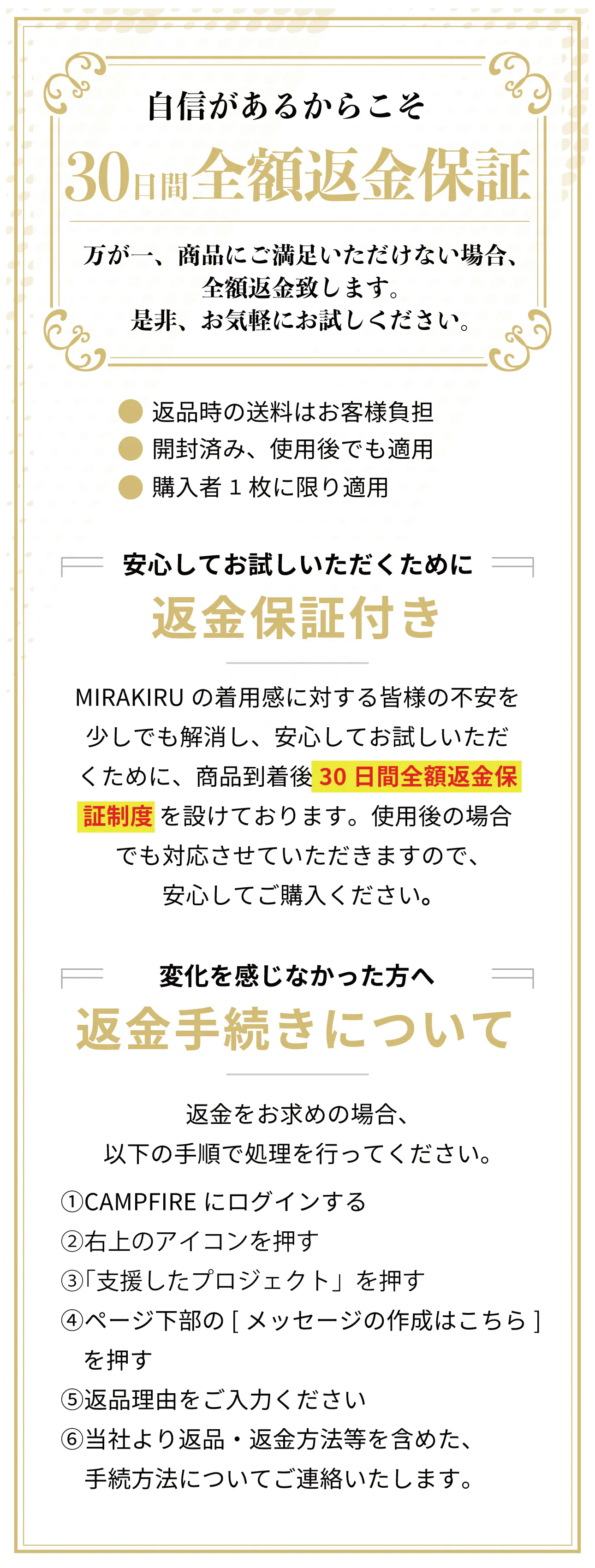 A.商品到着から30日間以内、ご購入のうち1枚に限り、全額返金対応を致します。