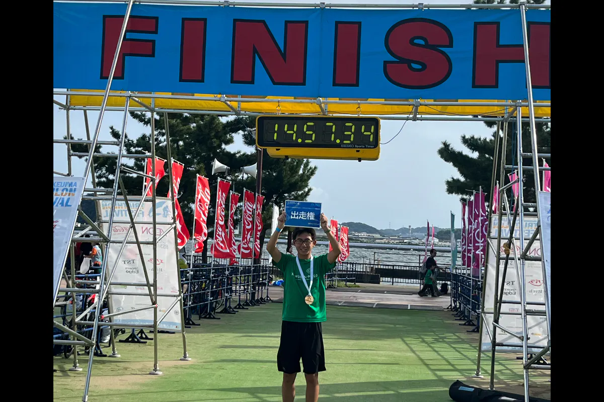 2025年2月に開催されたカーフマンシグネイチャーディアスロン選手権のエリート部門(ラン5㎞、バイク35㎞、ラン5㎞)に出場しました。この大会で僕は初めてエリートのレースに挑戦しました。このレースは、バイクで先頭と周回差がつくと競技を継続できなくなる過酷なレースでした。僕の目標は周回されずに完走することでした。レース中は、初めてということもありたくさんのアクシデントに見舞われました。バイクでは両足が攣り失速してしまい集団から遅れてしまい、心身ともに苦しいレースとなりました。そのアクシデントの中、僕は諦めず競技を続け、無事完走しました。