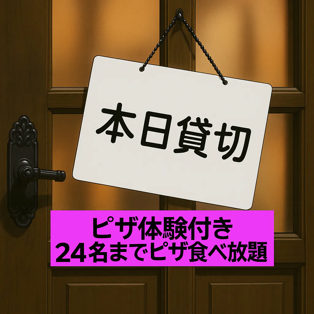 お店の貸切、ピザ体験付き、24名までピザ食べ放題、飲み放題