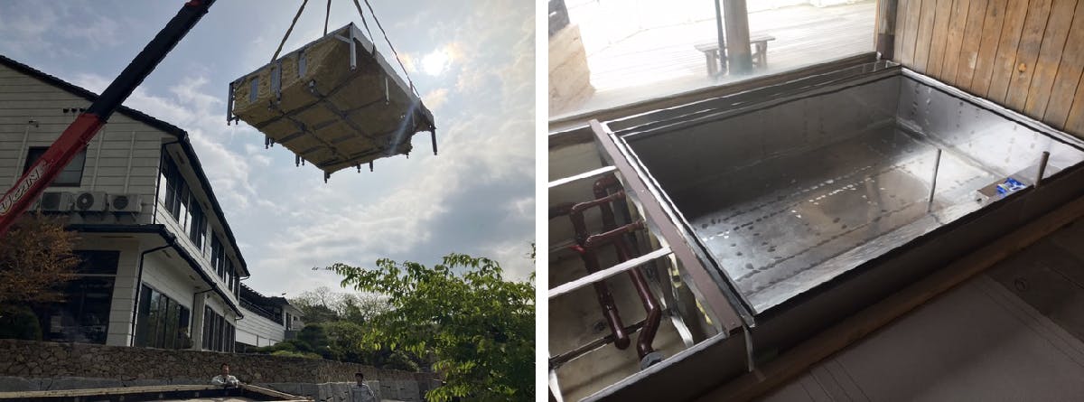 今回のプロジェクトでは、老朽化が進む「槙風呂」の全面的な改修を目指しています。※新設「寝湯」の施工(石材、配管、防水含む)