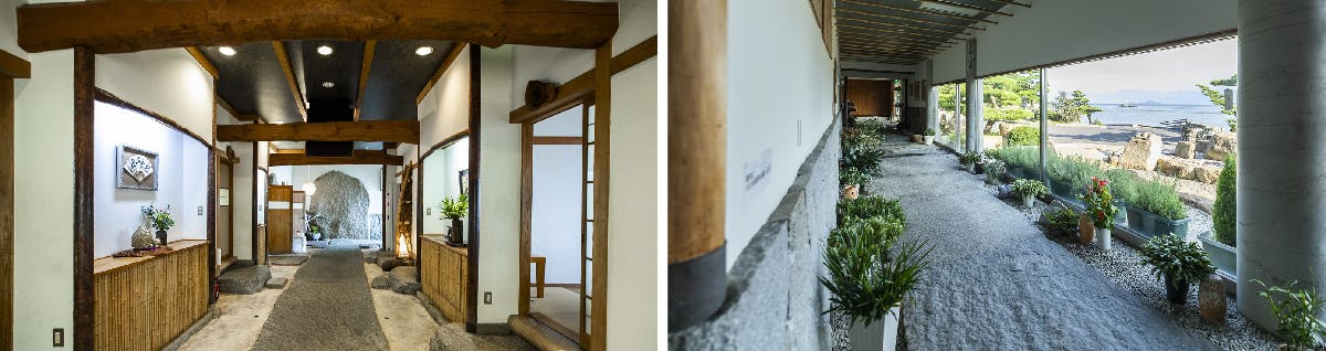 「千年松」は、1987年に愛媛県今治市大島にて創業された、海と山に抱かれた一軒宿です。その立地は、まさに自然と一体になるための舞台。目の前には来島海峡、背後には館山。静かな波の音と、山の緑に包まれて、時間の流れがふと緩やかになる――そんな特別な空間です。