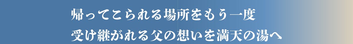 困難な状況から、取り壊してしまうという選択肢もありました。しかし、私たちは迷うことなく引き継ぐことを選択し昨年より改修に着手しております 。父が私たちに残してくれたものは建物だけではなく、ここに集い、楽しんでくださる皆様へ癒しの空間を提供するという熱い想い、そしてこの場所を愛してくださるお客様です。それを守り引き継ぐため、この「満天の湯」と、父の思いを形として未来につなぎたい。