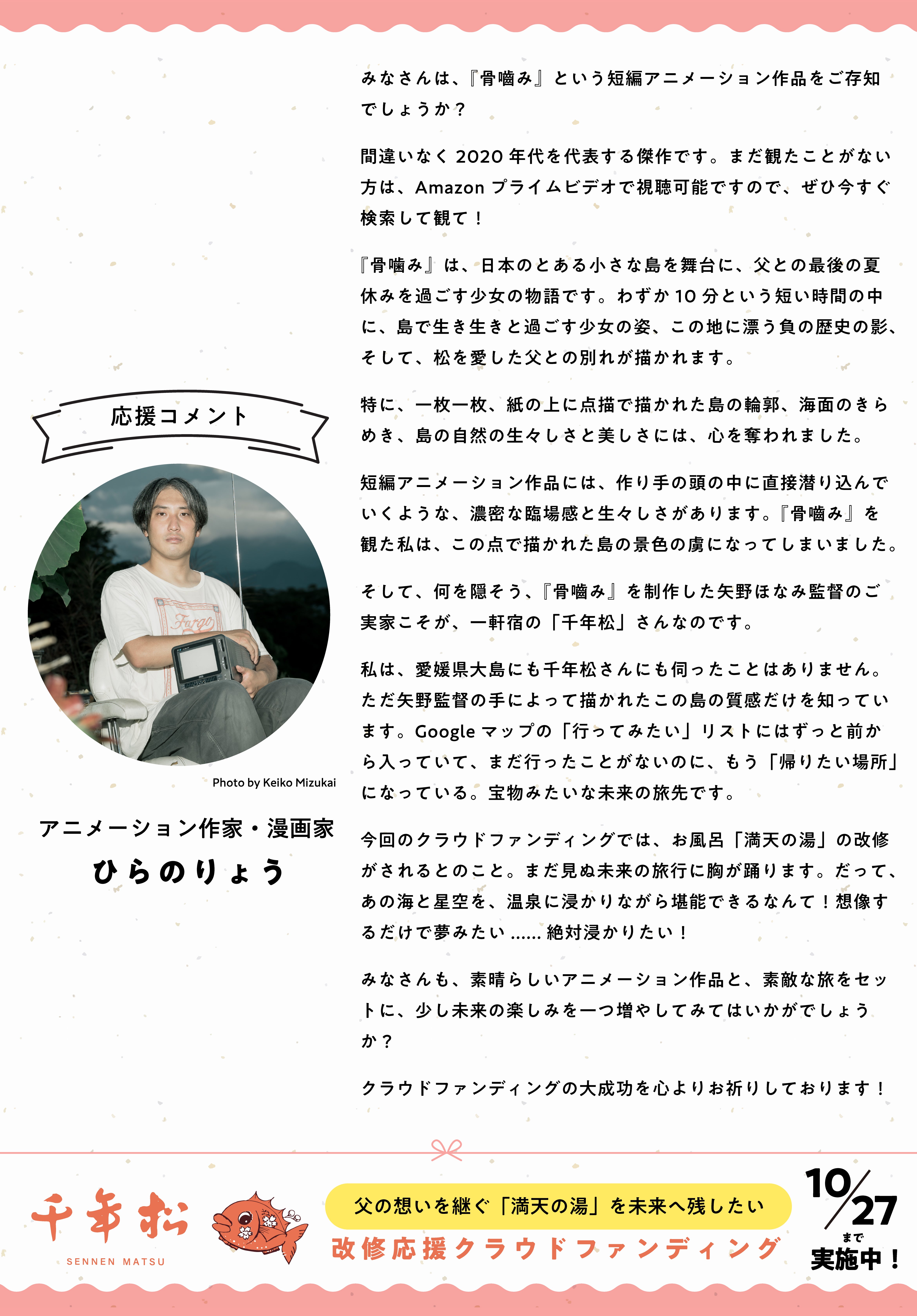 皆さま、いつも温かいご支援と応援を本当にありがとうございます。おかげさまで、皆さまの力強いご支援により、サードゴールの400万円を達成いたしました!心より深く感謝申し上げます。この挑戦をここまで進めることができたのは、応援してくださるお一人おひとりのお気持ちのおかげです。スタッフ一同、感激と感謝の思いでいっぱいです。満天の湯の改修には、総額で約800万円が必要となります。そのため、最後の挑戦として「ファイナルゴール450万円」を掲げることにいたしました。クラウドファンディングの実施期間は、10月27日(日)23時59分までです。残りわずかな期間となりますが、最後まで温かく見守っていただけましたら幸いです。引き続きの応援を、どうぞよろしくお願いいたします。心からの感謝を込めて。海宿 千年松 スタッフ一同