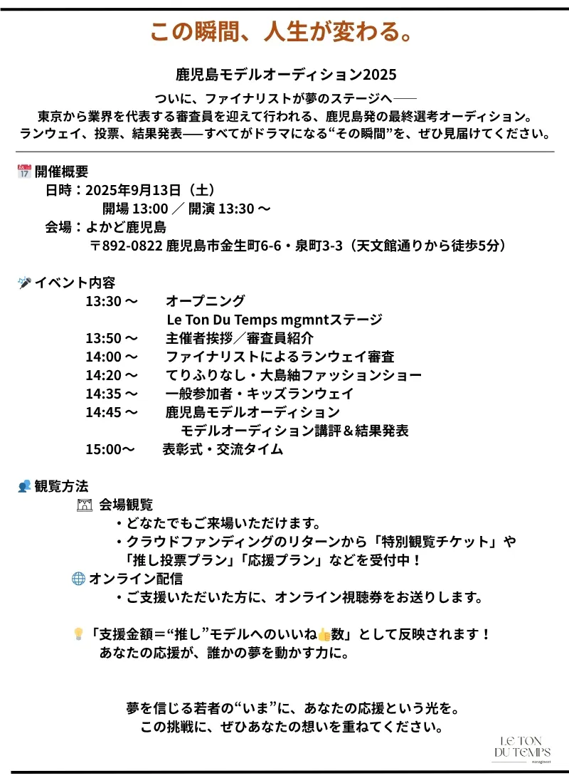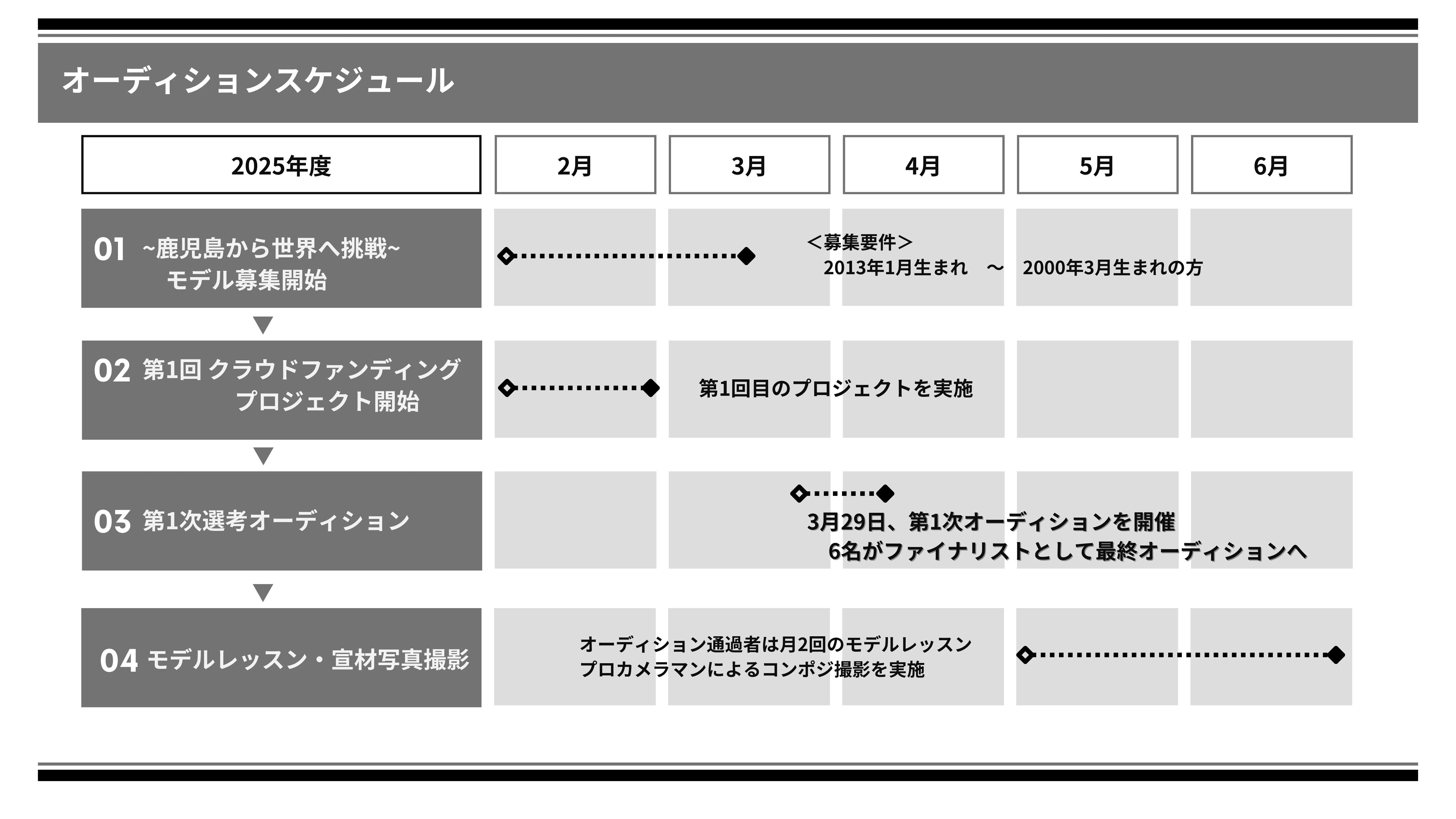 2025年3月に鹿児島で実施した予選オーディションには、さまざまなバックグラウンドを持った方々から多数エントリーいただきました。