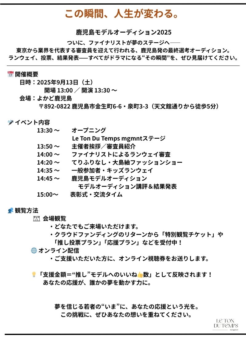 2025年3月に鹿児島で実施した予選オーディションには、さまざまなバックグラウンドを持った方々から多数エントリーいただきました。