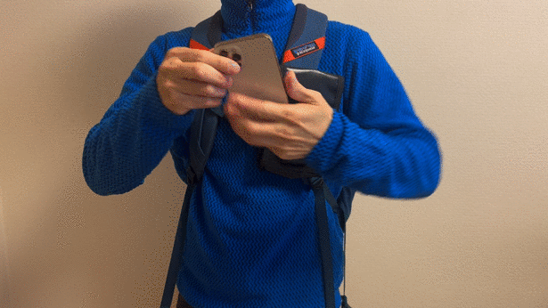 背面のベルト部分に滑り止め加工を追加しました。リュックのショルダーベルトに取り付けてもずれにくい仕様で、ピタッと固定できます。