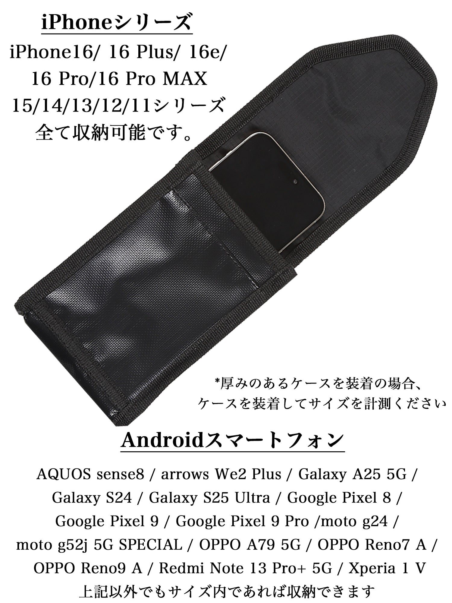 また大型スマートフォンにも対応いたしました。高さ17cm×幅8.2cm×厚み2cmまでのスマートフォンが収納可能です。