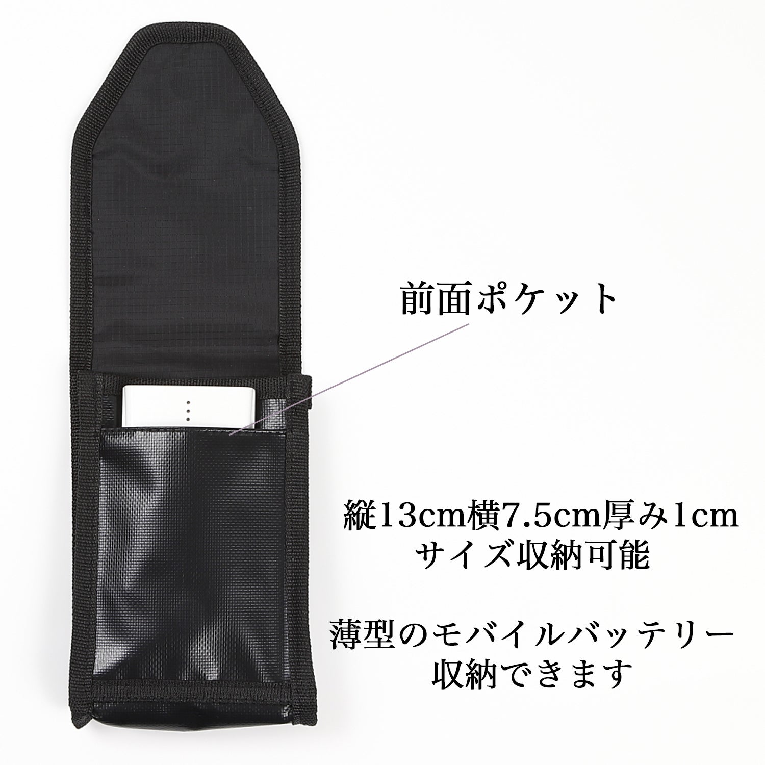 前面ポケットには薄型のアイテムを収納可能。スリムタイプのモバイルバッテリーも入ります。