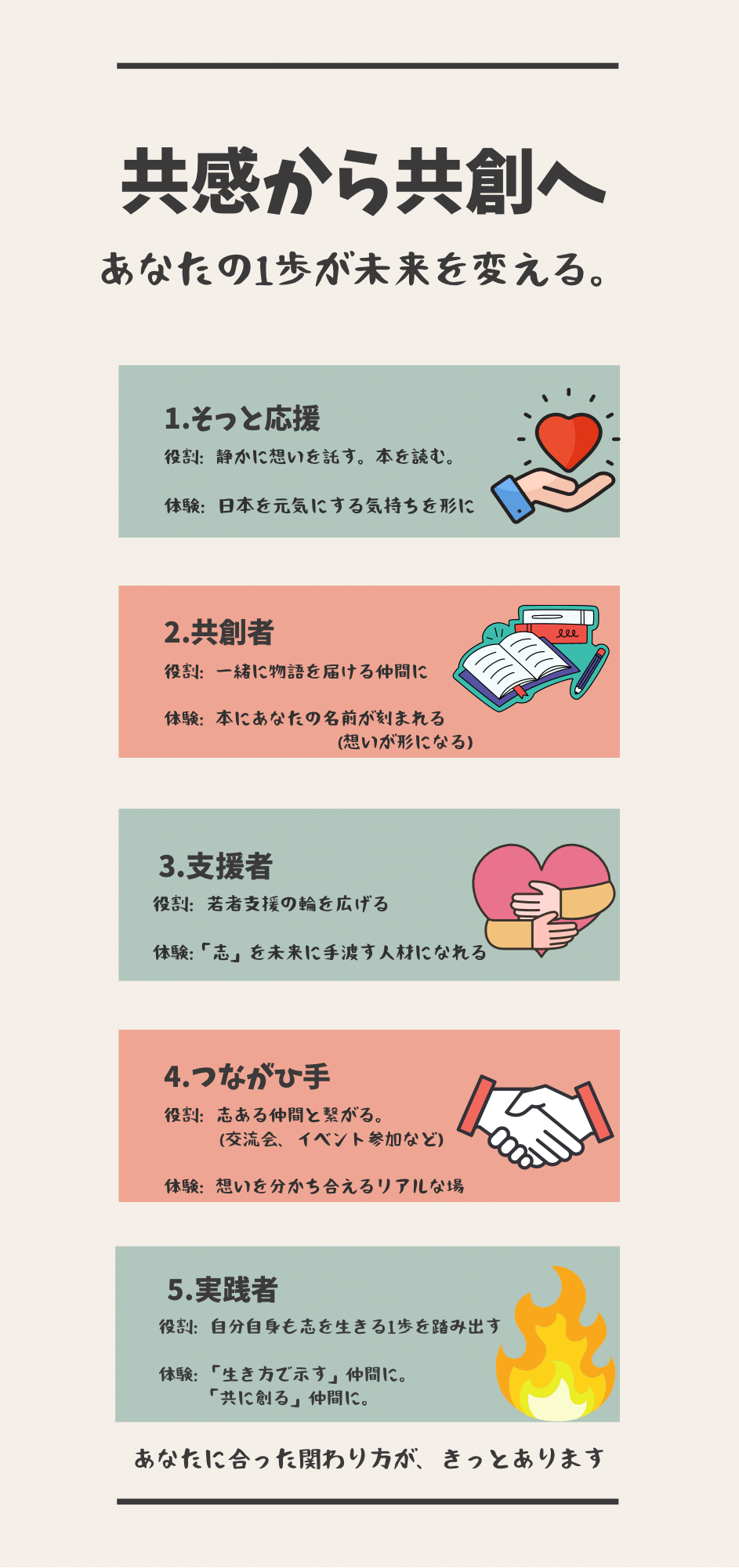想い:あなたの志に深く向き合い、ともに未来を描きましょう。ご希望があれば、今後の活動への具体的な関わり方もご提案させていただきます。