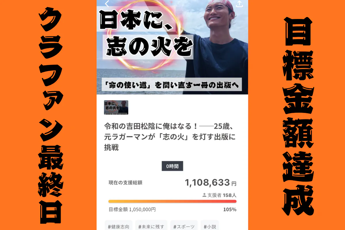 2025/08/12 23:36【達成のご報告】ついに…ついに達成しました!!!30日間、全力で走り抜けたクラウドファンディング。終了15分前、最後の瞬間に目標金額 1,050,000円を突破し、この本の出版が正式に決まりました!支援してくださった皆さん、シェアで広げてくれた皆さん、温かい言葉をかけてくれた皆さん、一つひとつの想いと行動が、この挑戦をゴールまへと押し上げてくれました。本当に、本当にありがとうございました!!![この挑戦で感じたこと]私にとって、この挑戦は「自分を表現すること」でした。以前の私は、自分の想いをさらけ出すことに抵抗がありました。そして今の社会にも、想いを出しにくい空気があると感じています。でもこの3年間、私は「違和感」に従い続けてきました。そして今、私にとって最大の違和感は「表現しないこと」だと気づいたんです。それは魂の欲であり、従うことが自然でした。覚悟を決め、行動し、発信を始めたことで、内側から湧き上がる喜びを感じました。本のテーマでもある「違和感に従う」ことこそが、本当に望む人生への道だと改めて確信しました。[これからの流れ]・9月末日に入金後、出版社との打ち合わせを開始します。・進捗は随時活動報告しますので、ぜひ楽しみにしてください。・支援いただいた皆さんには、完成した本を心を込めてお届けします。[最後に]応援してくださった皆様、本当にありがとうございました!ここがゴールではなく、新たな挑戦のスタートです。出版はもちろん、あらゆる表現を通して「志の火」を灯していきます。すべての人が魂を表現できる土壌をつくるため、私自身が在り方で挑戦、表現し続けます!共に魂を燃やし、この時代を駆け抜けましょう。これからも、どうぞよろしくお願い致します! もっと見るクラウドファンディング残り1日!