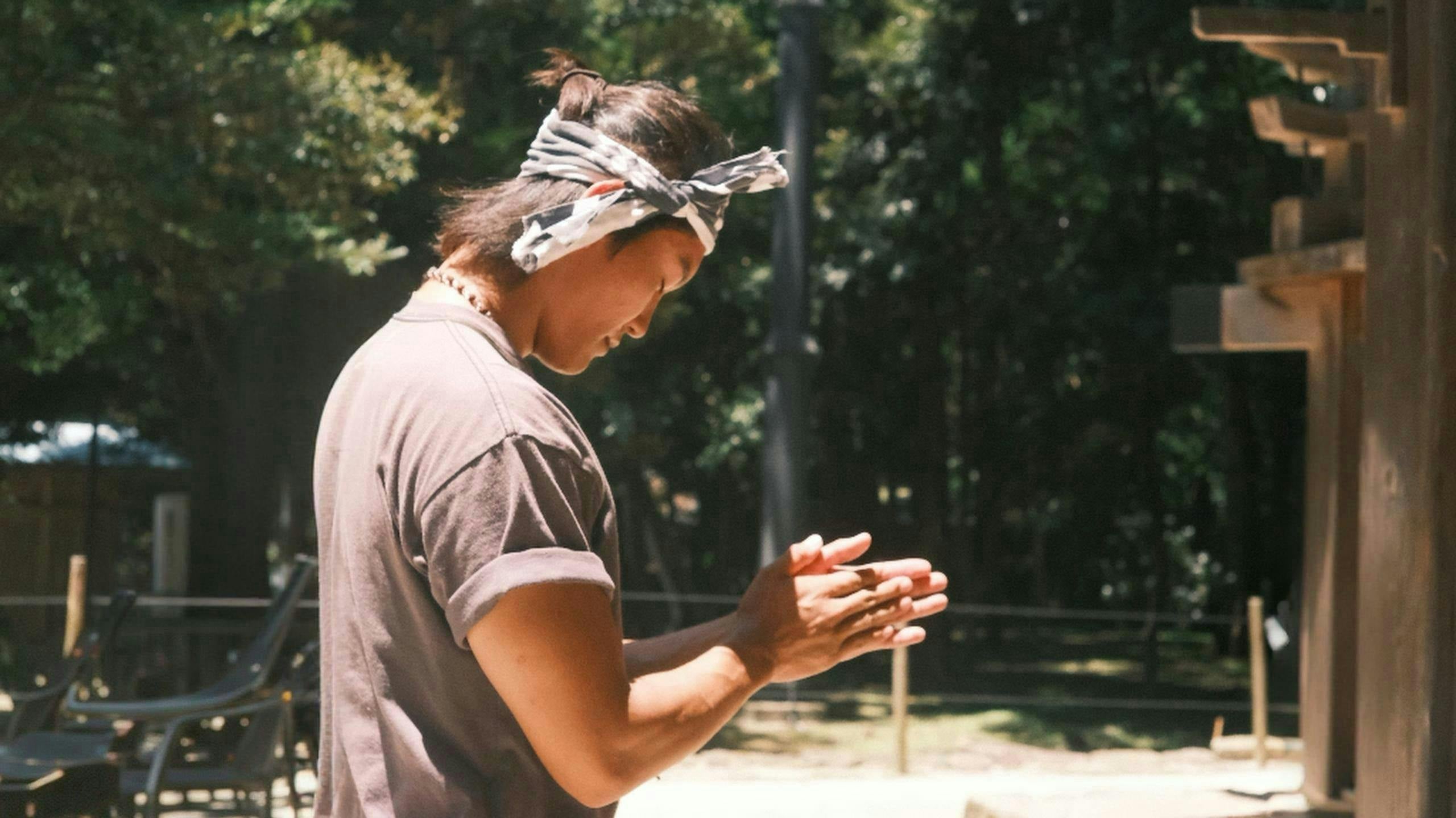 彼は毎朝、砂浜で四股を踏み、裸で海に入り、太陽の光を全身で浴びながら一日を始めます。