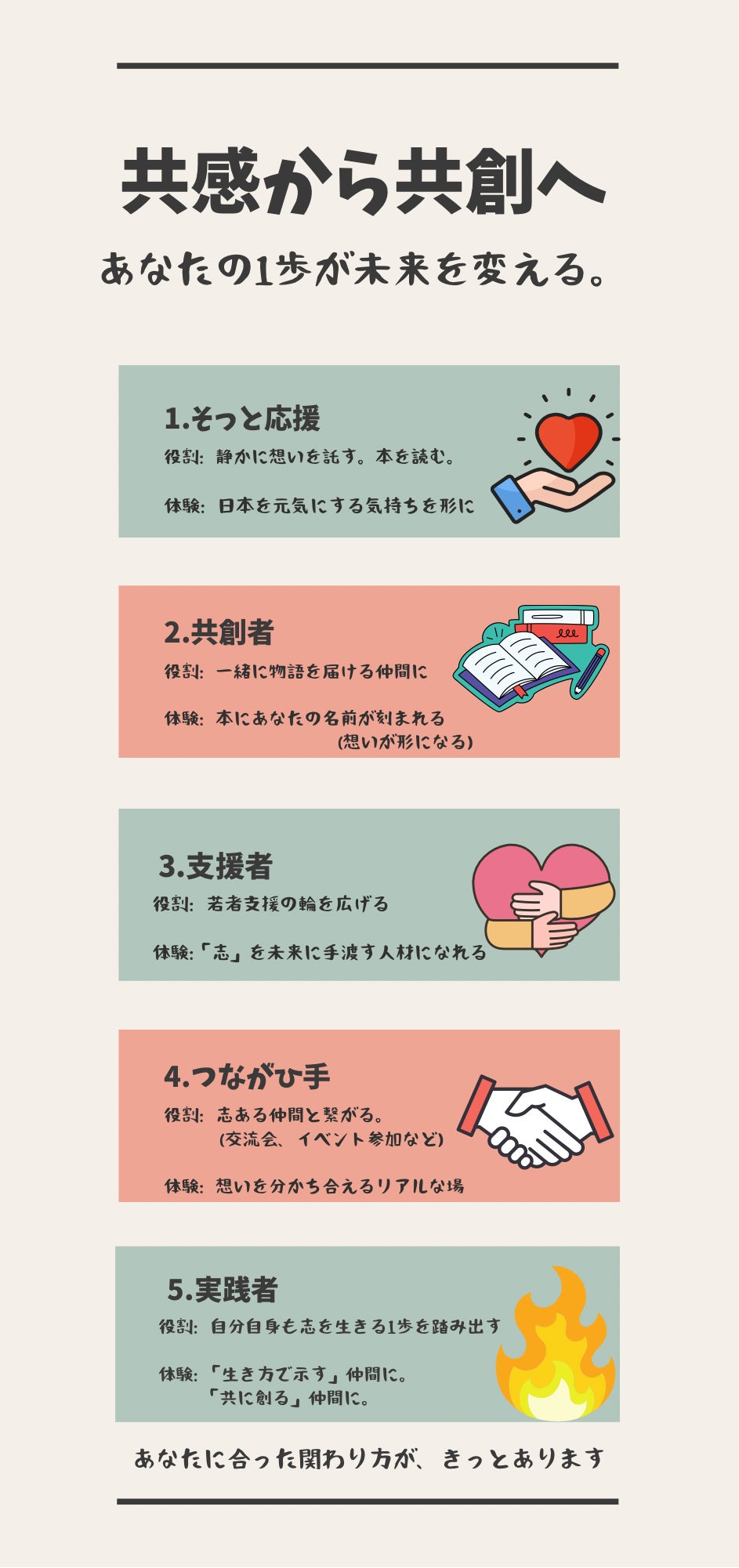 ・書籍巻末に、あなたの「志」を掲載(20〜30字程度/希望者のみ)