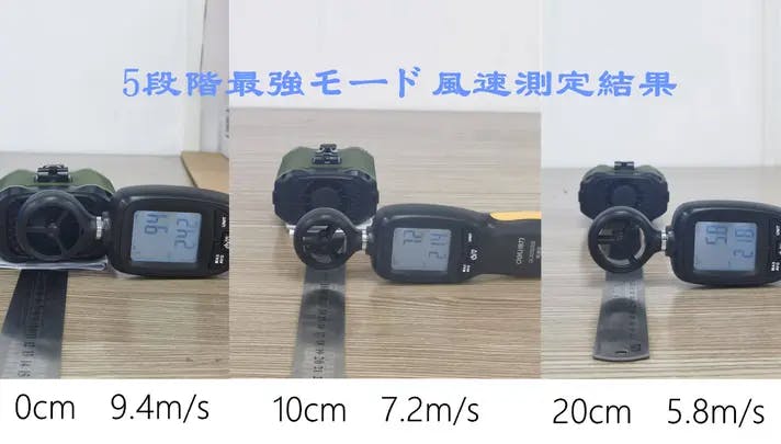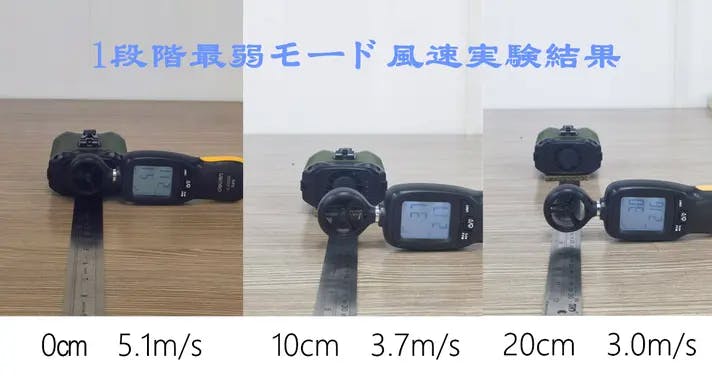 ※市販の風速計を使用して、0cm(ファン直前)、10cm、20cmの位置で計測しました。