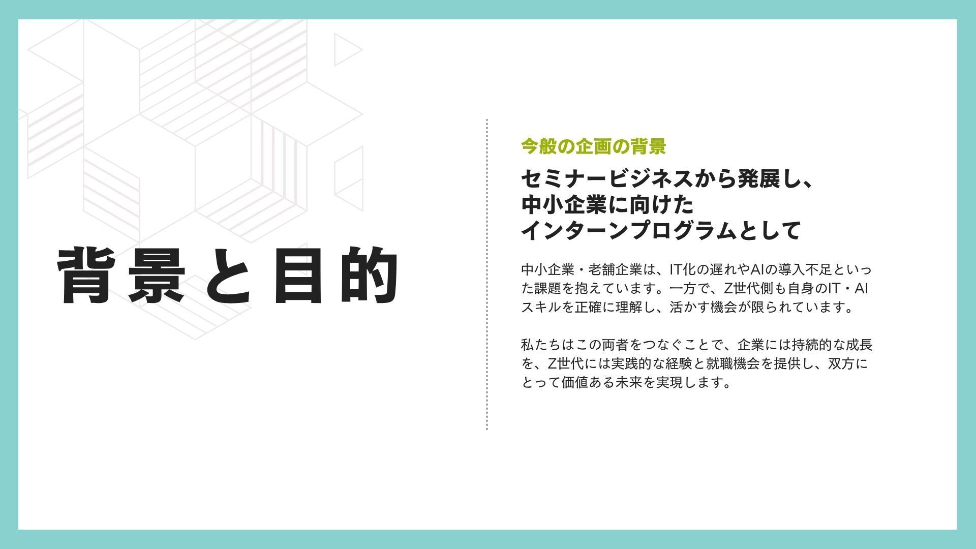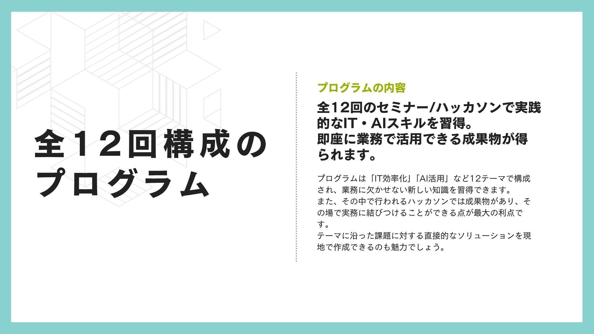 そこでこの度は、「Z世代とともに作る・実務に使える」をテーマとして、IT、AI導入を手助けするプログラムを開催しようと考えています!
