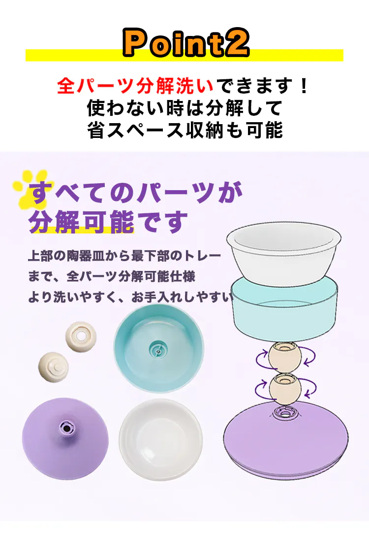【使用上のご注意】●ペットの大きさに合わせて高さを調節してください●白いセラミック皿は電子レンジ・食洗機対応可;その他土台部分は電子レンジ・食洗機使用不可●収納時は全分解して収納が可能です