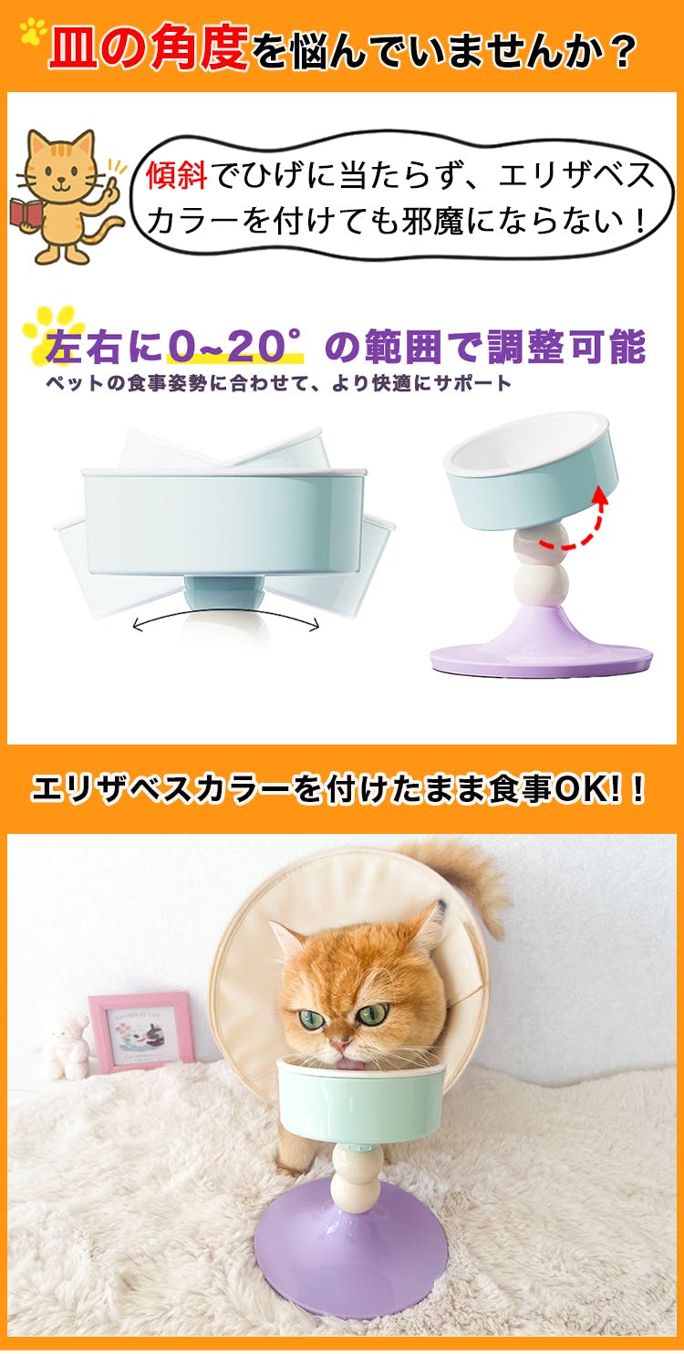 ③0〜20度角度調整付きでエリザベスカラーを付けても食事を妨げない