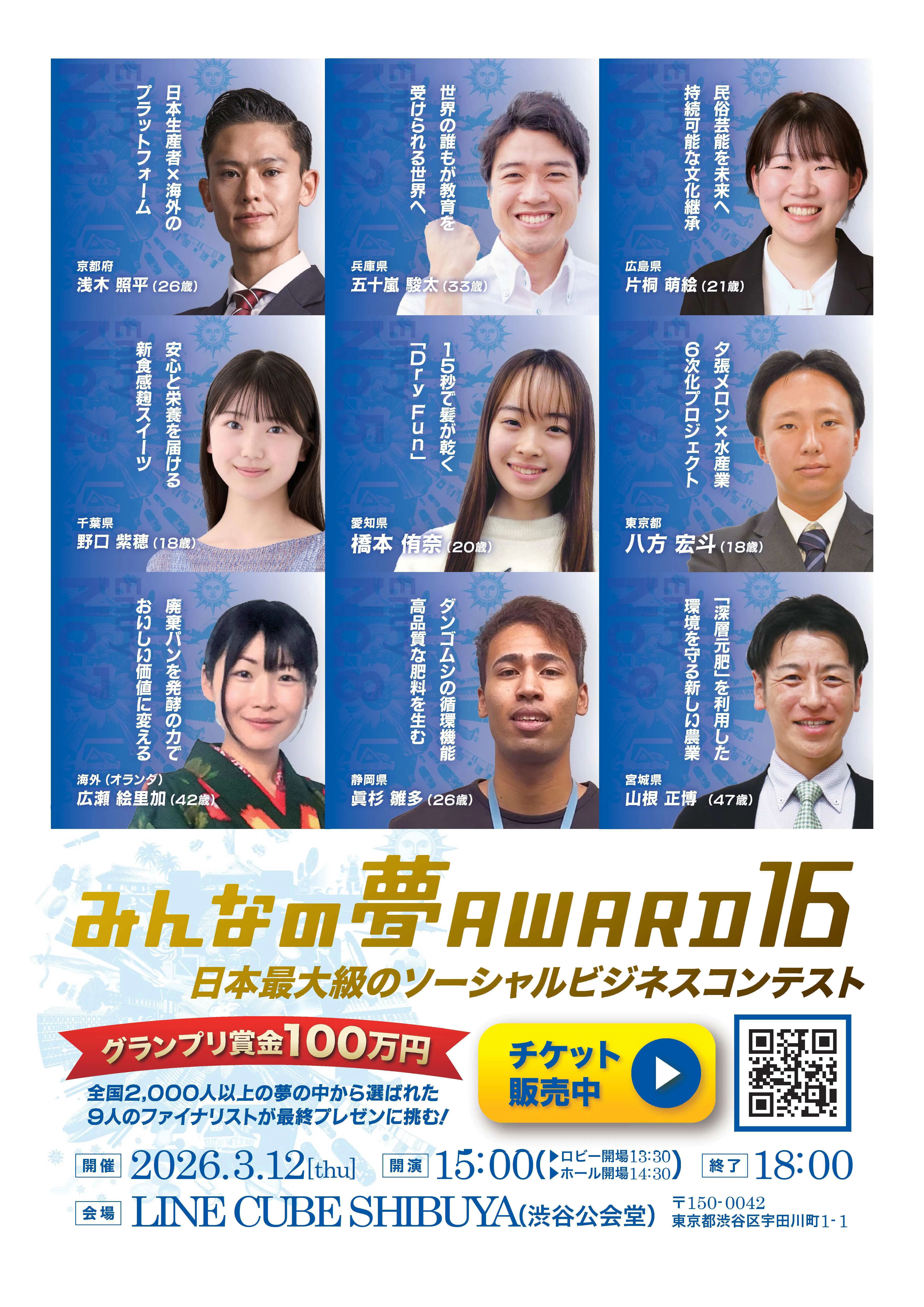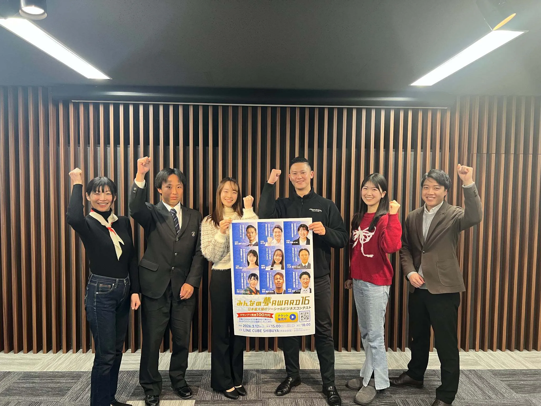 『みんなの夢 AWARD』は、日本を代表する企業がスポンサーとして名を連ね、 国内のビジネスコンテストの中でも多くの信頼を得ている大会です。第16回大会は今年3月に東京・渋谷のLINE CUBE SHIBUYA(渋谷公会堂)で開催します。