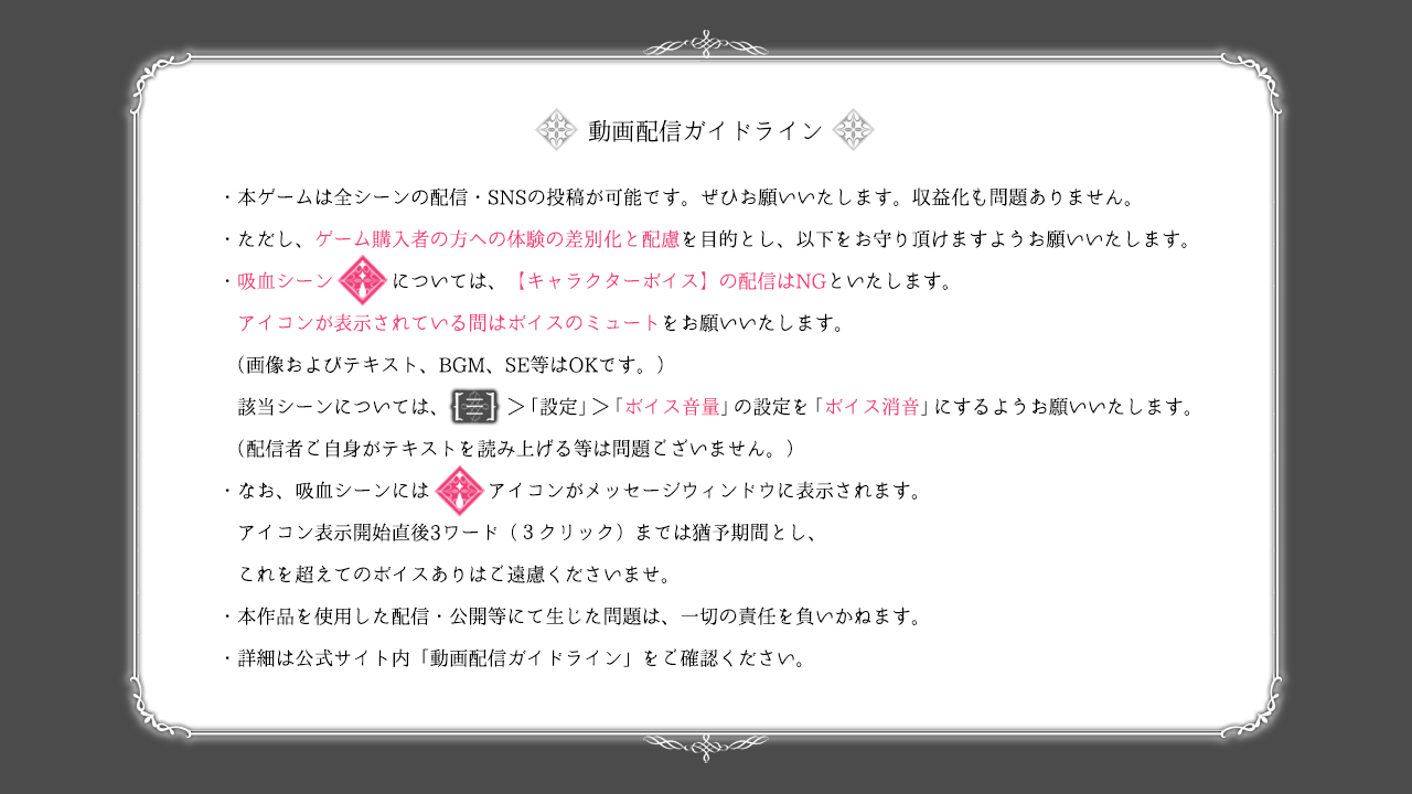 体験版の全てを配信して頂けますが、一部のシーンではゲームを購入される方への体験の差別化と配慮を目的とし、キャラクターボイスのミュートをお願いしております。 該当シーンになるとアイコン表示されますので、「三(ハンバーガーマーク)」>設定 より「ボイス音量」を「ボイス消音」に設定してくださいませ! それ以外の制約はありません!