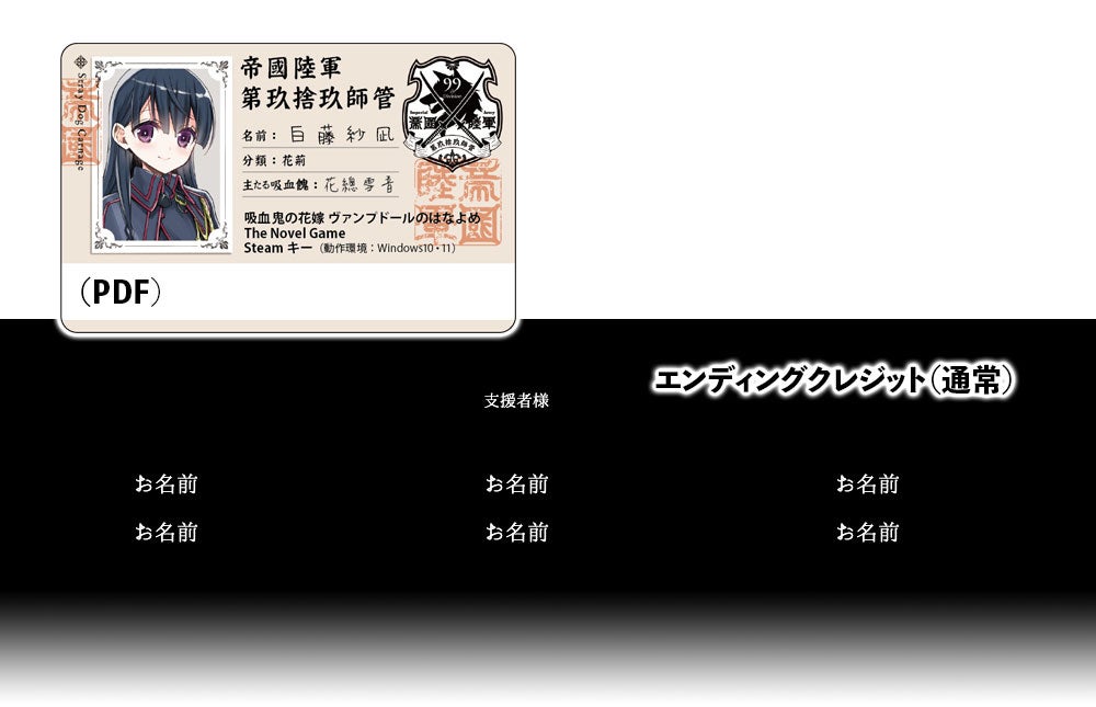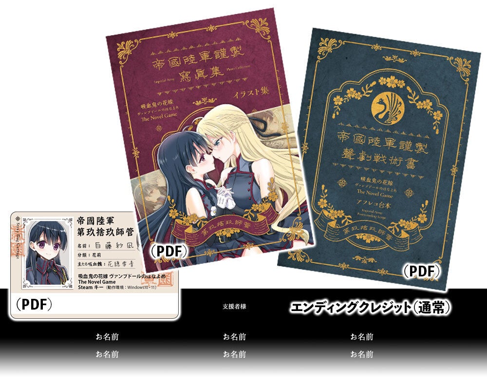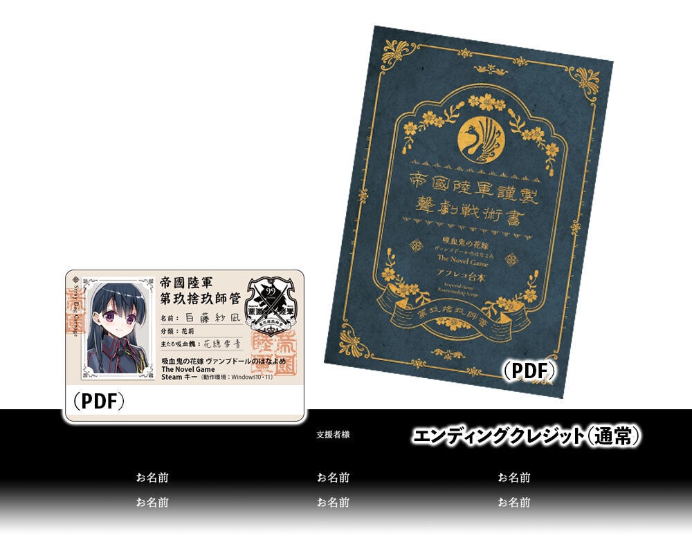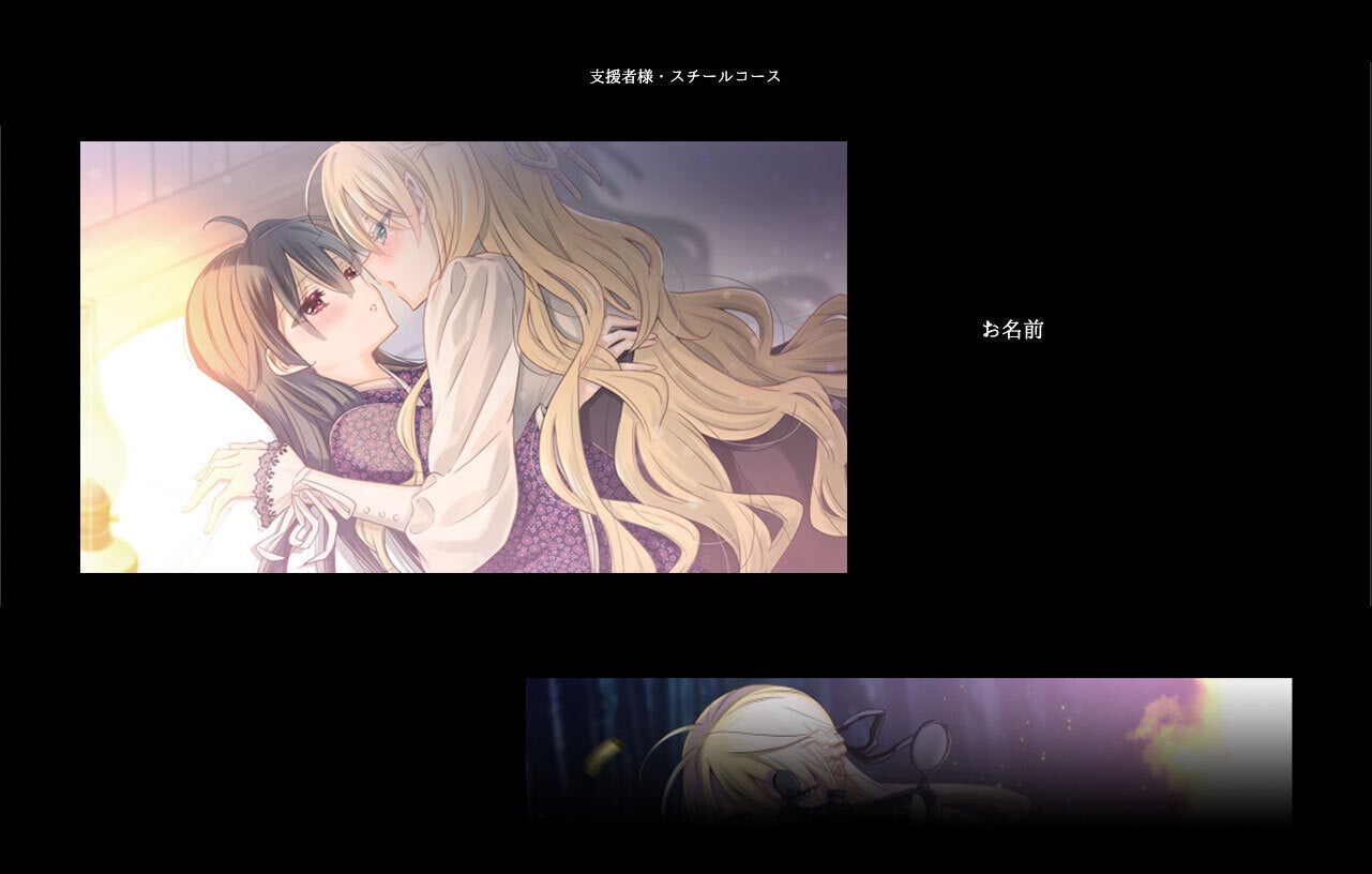 *複数コースをご支援頂いた方で、エンディングクレジットが重複している場合、は支援額が大きい方におまとめさせていただきます。ただし、アイコン、スチールのみ、イラストを変更しての複数掲載も可能です。