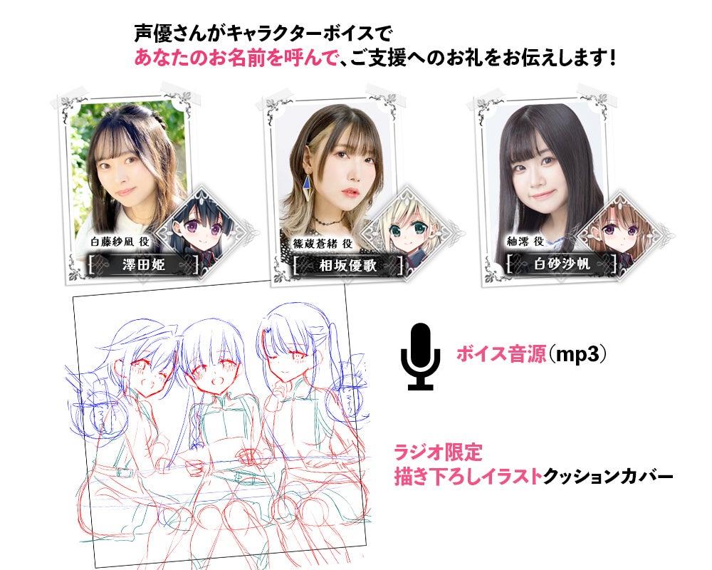 また、紗凪、蒼緒、澪の〈花荊-はなよめ-〉3人が楽しくお喋りしているラジオ限定描き下ろしイラストのクッションカバーがついたコースとなります!