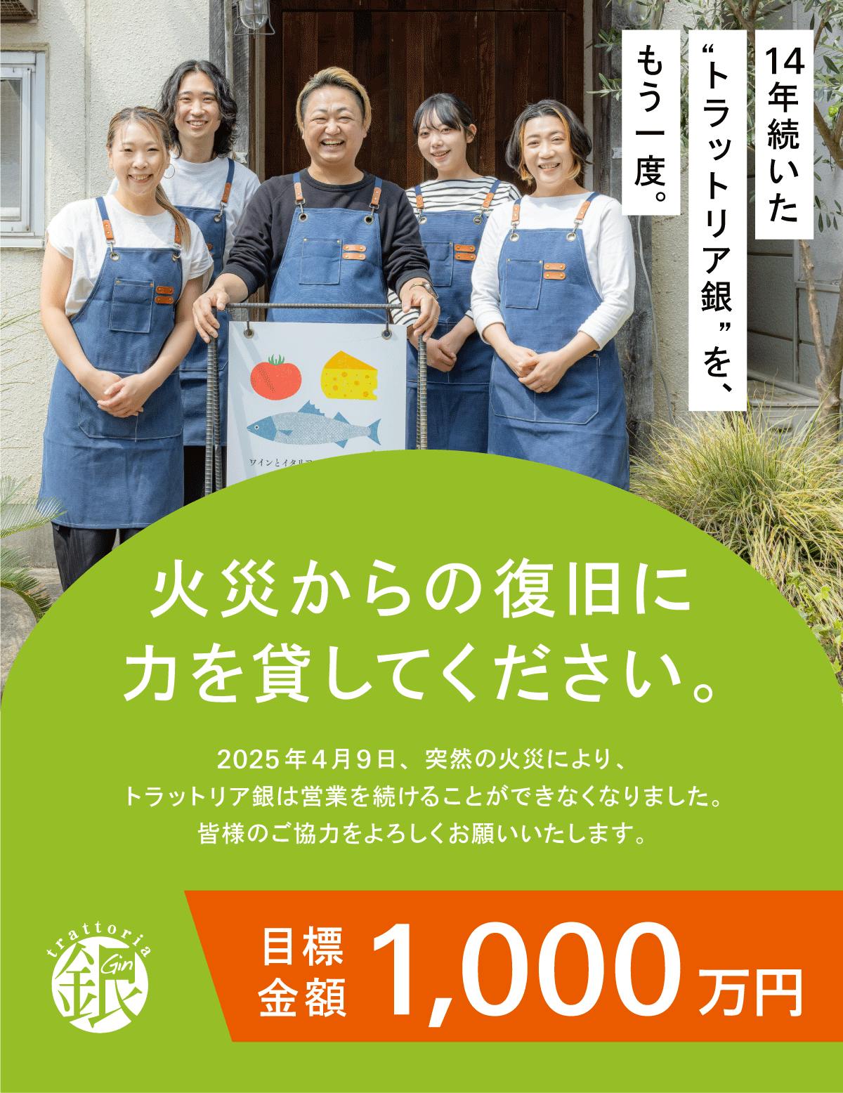 この挑戦は「新たなスタート」ではなく、「あの日からの続き」を取り戻すためのものです。誰かの日常の食卓として、もう一度、トラットリア銀を皆さまと共に形にしていきたい。その思いで、目標額を掲げました。