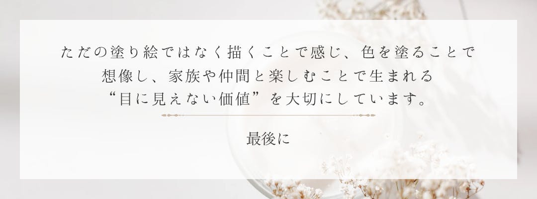 ただの塗り絵ではなく、描くことで感じ、色を塗ることで想像し、家族や仲間と楽しむことで生まれる“目に見えない価値”を大切にしています。