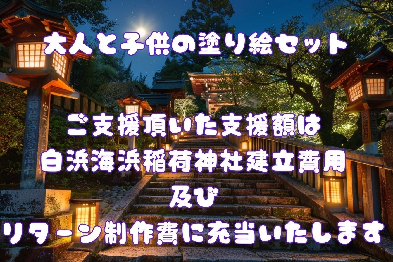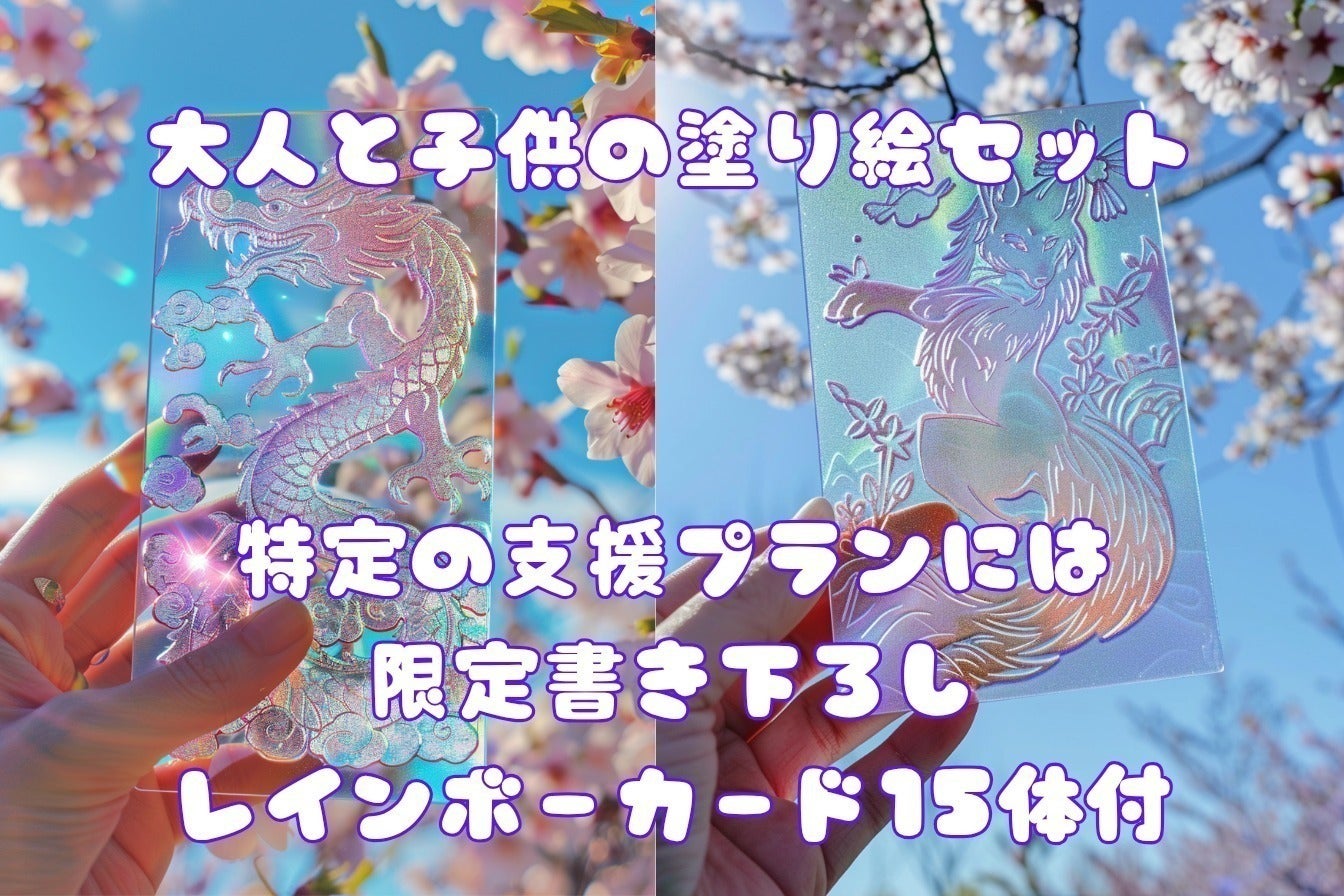 ご支援いただいた方には、完成した塗り絵冊子に加え、限定祈祷済レインボーカードや、妖怪ステッカー、奉納特典などをご用意しています。