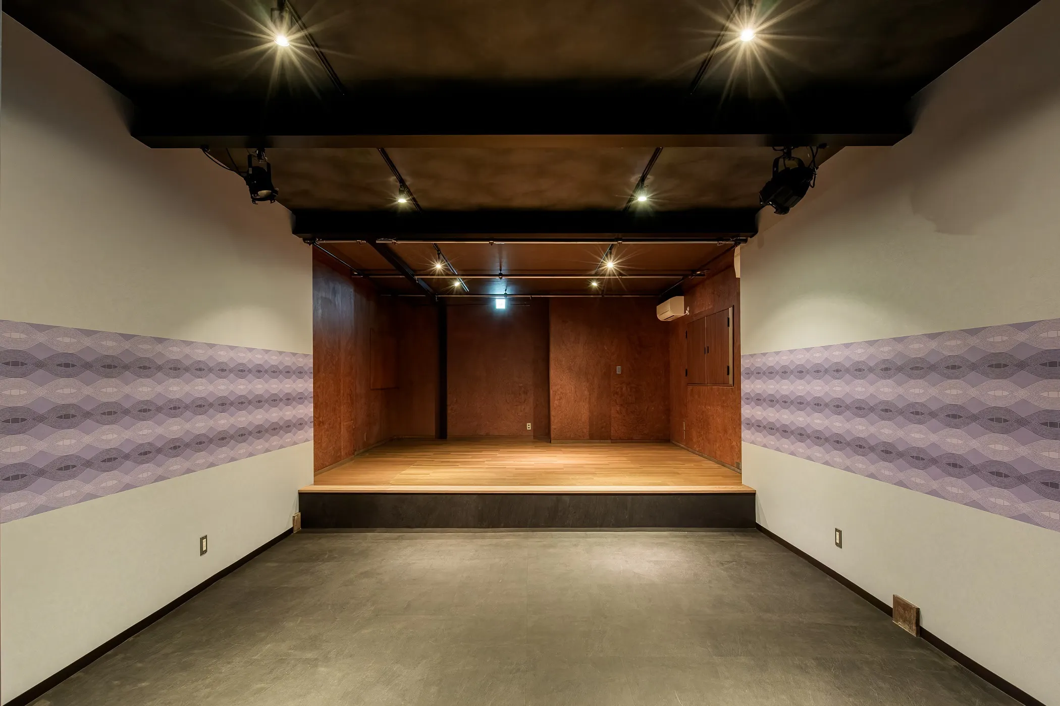 間口:4.8m 奥行:舞台4.7m 客席5.8m 天井高:舞台2.4m 客席2.8m