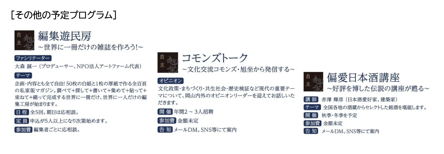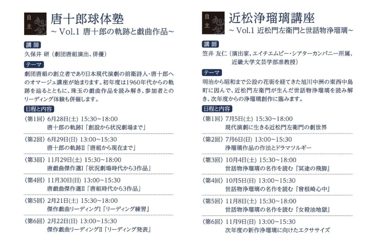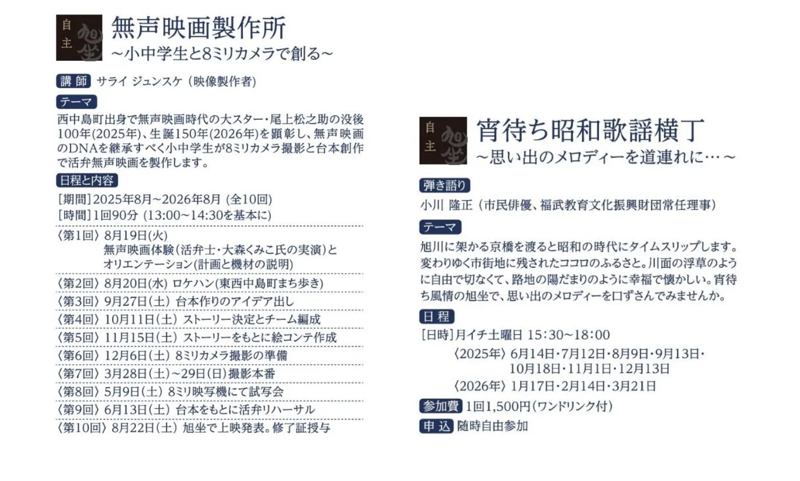 旭坐の主催企画となります。地域の歴史と文化を反映しながら、伝統に培われた日本文化の普遍性と、伝統に貫かれた革新の精神性を両立させた「不易と先駆」をコンセプトに実施してまいります。