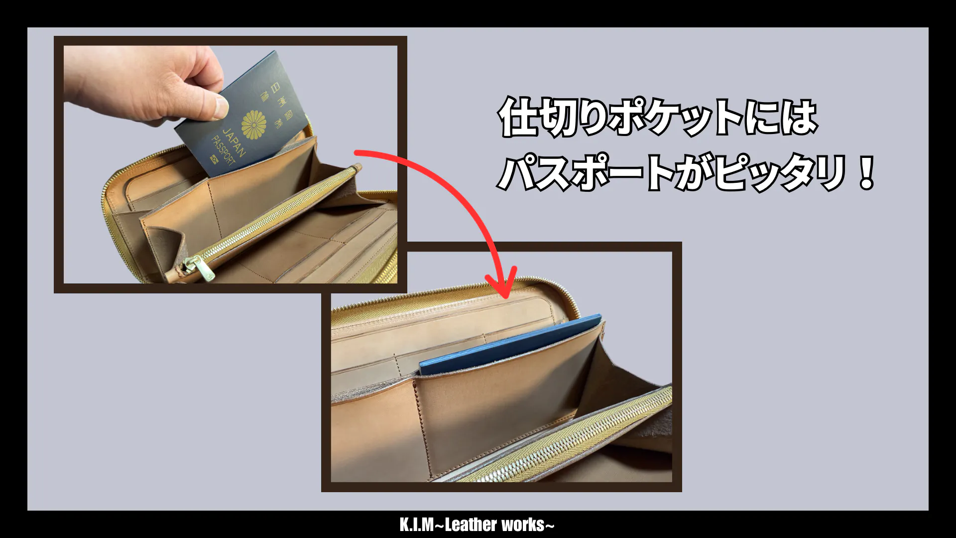 追加仕切りにはパスポートピッタリのポケット付き。