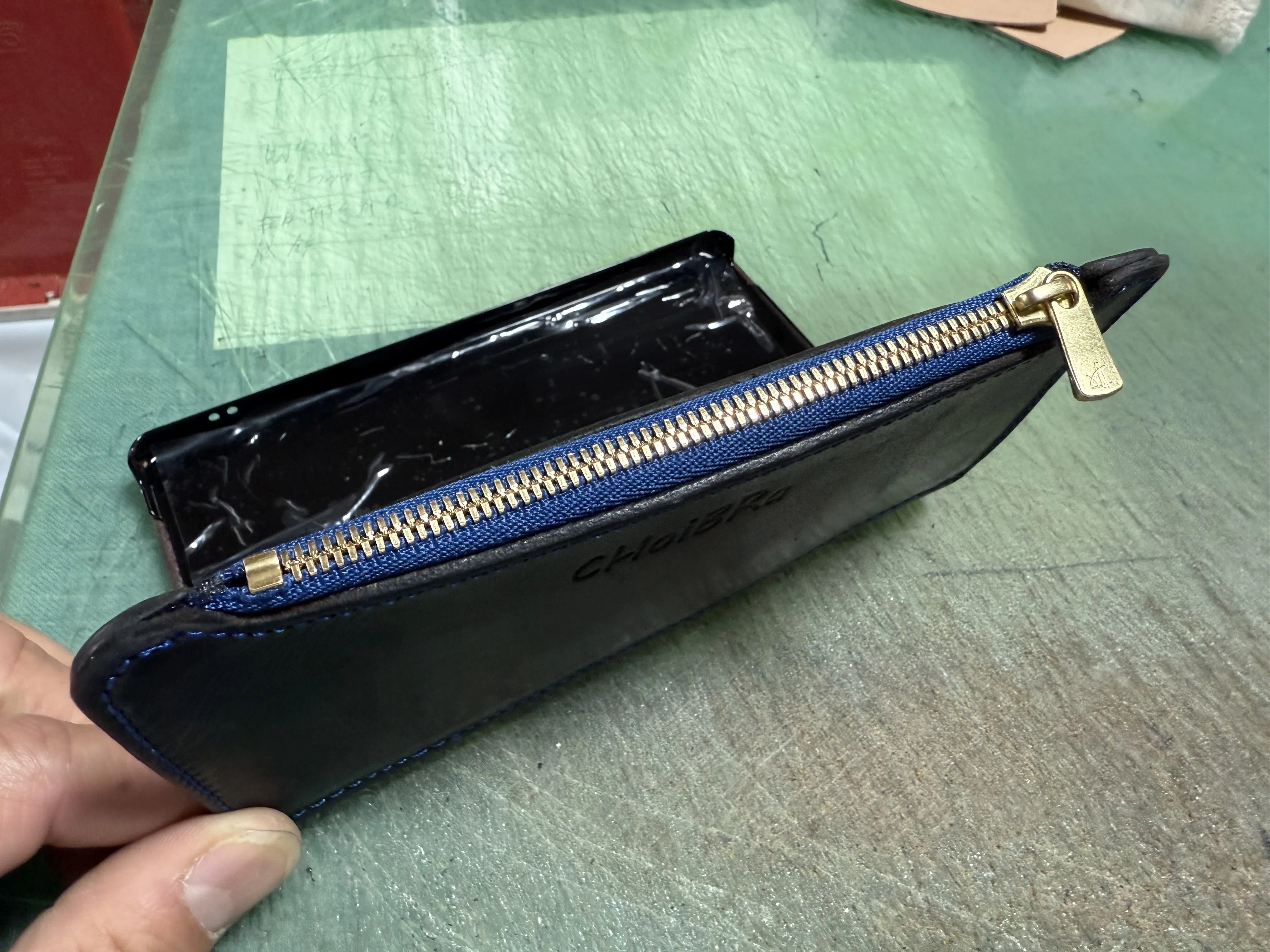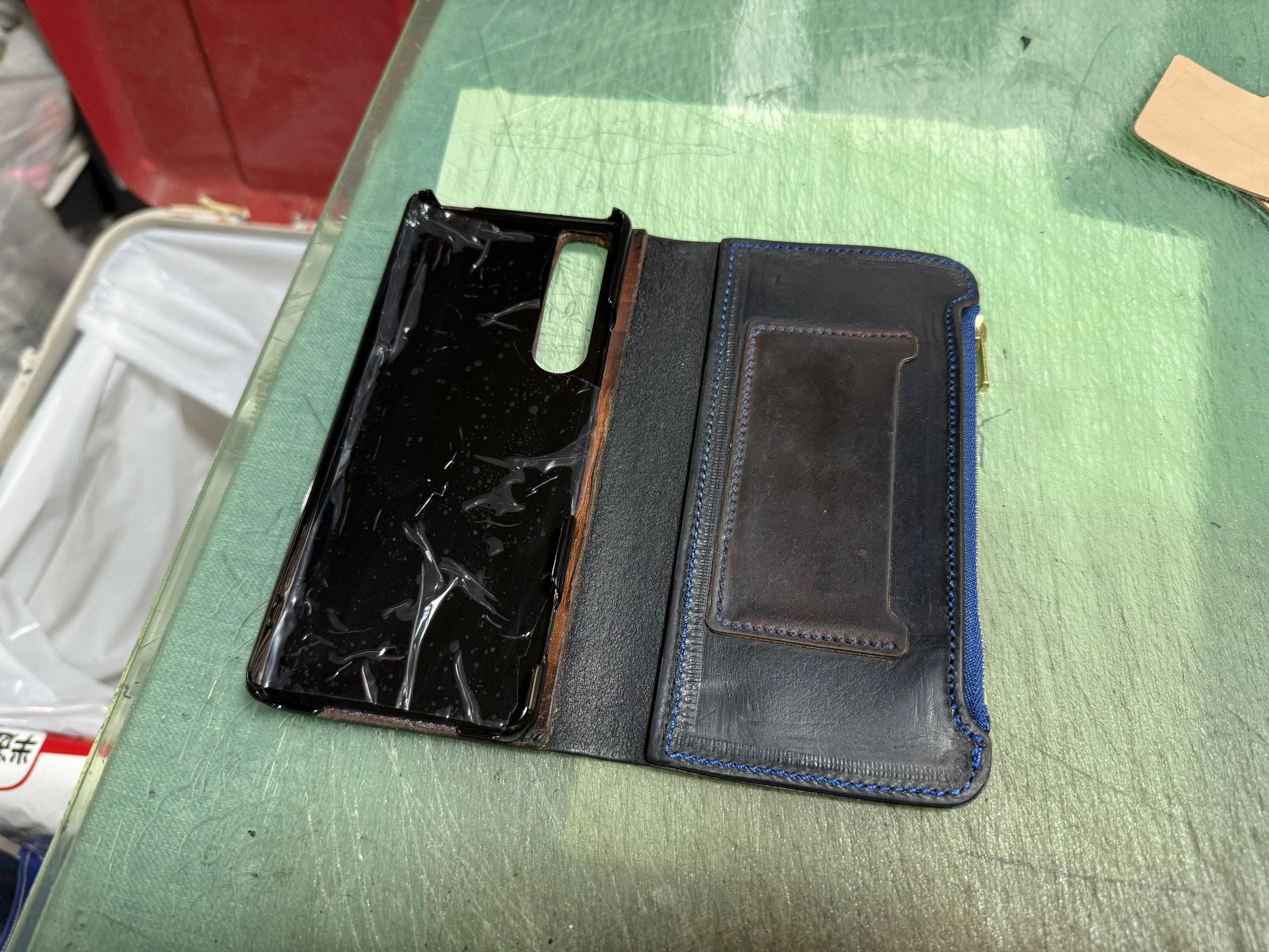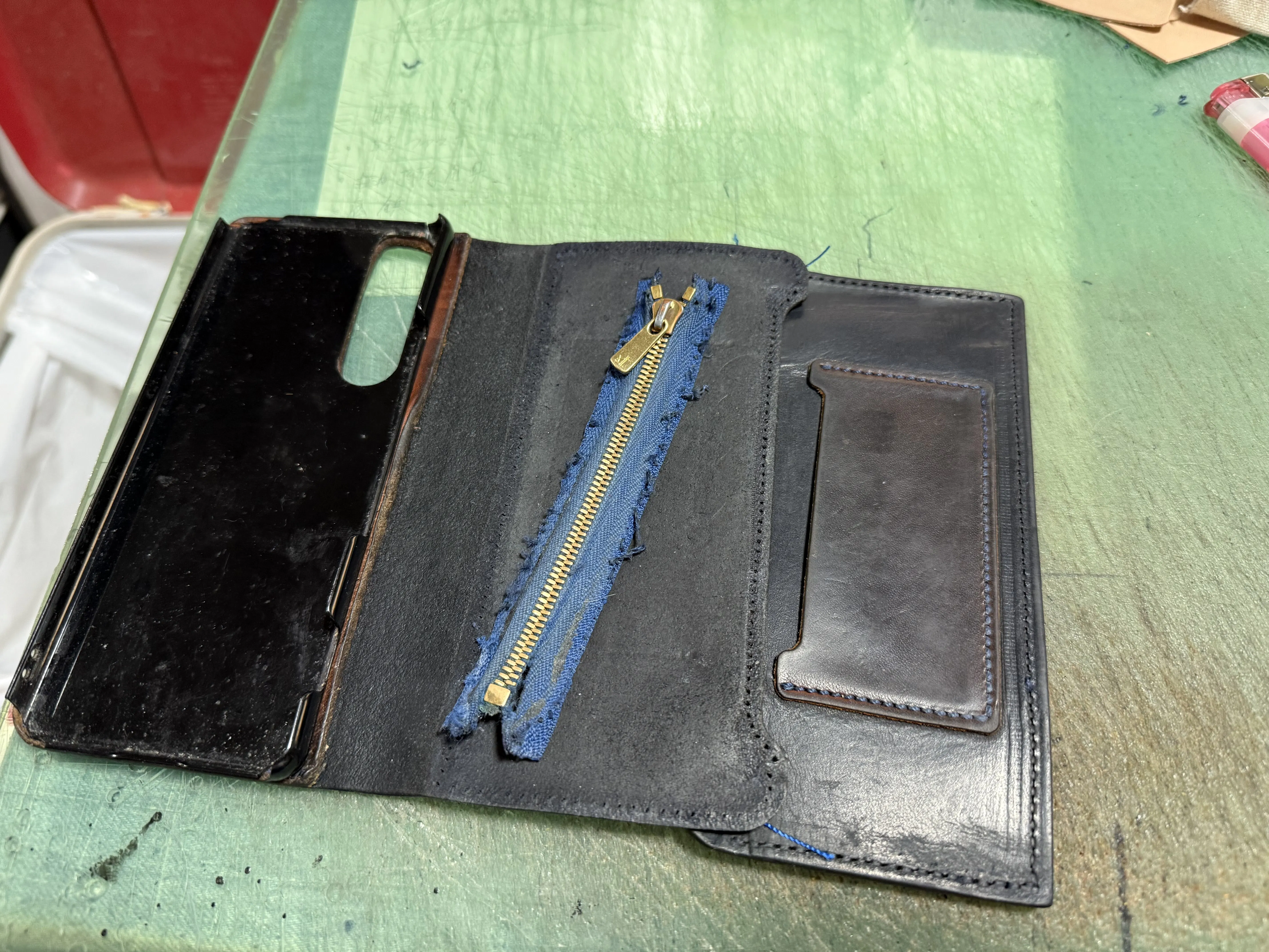 以前購入頂いたスマホケースの修理。ケースは割れファスナーが破れてしまったとの事。