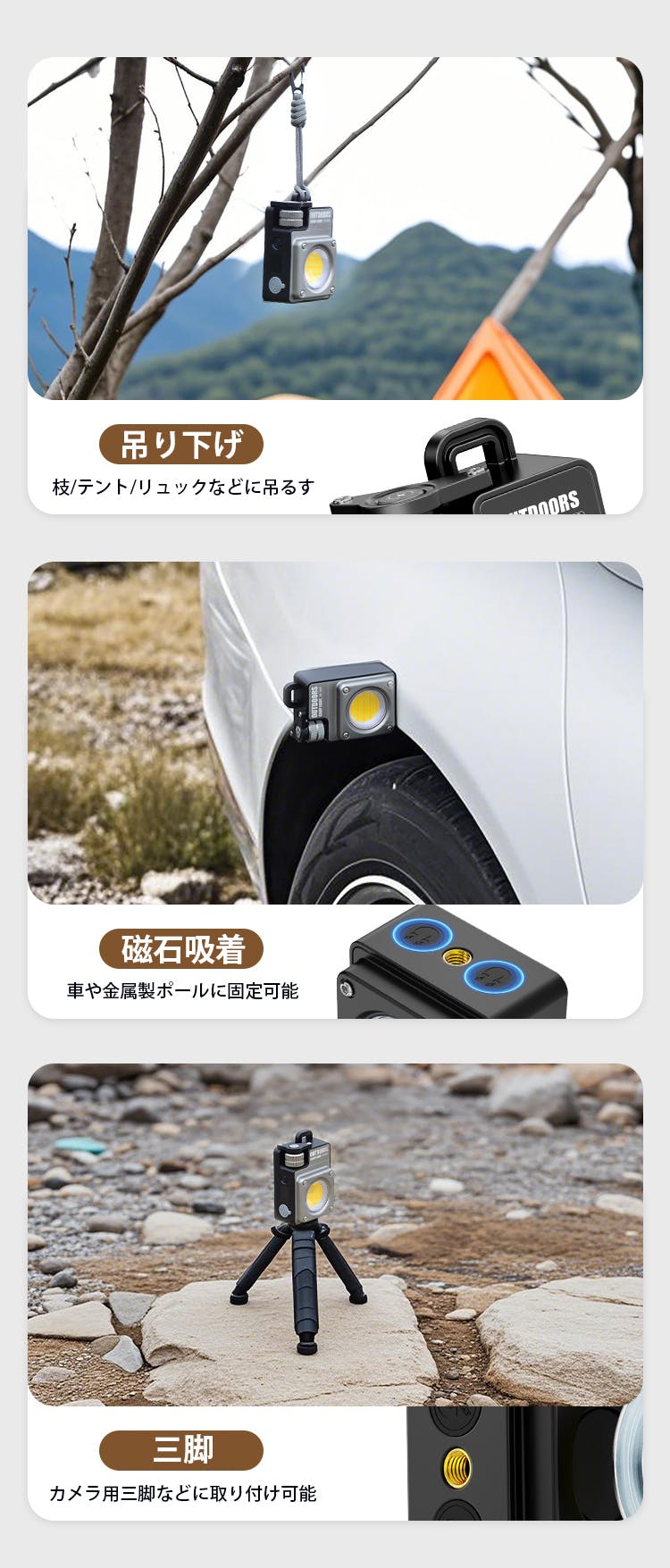マグネット搭載、三脚対応、吊り下げデザインとなっており、アウトドアや自宅、緊急時など様々なシチュエーションで活躍します。