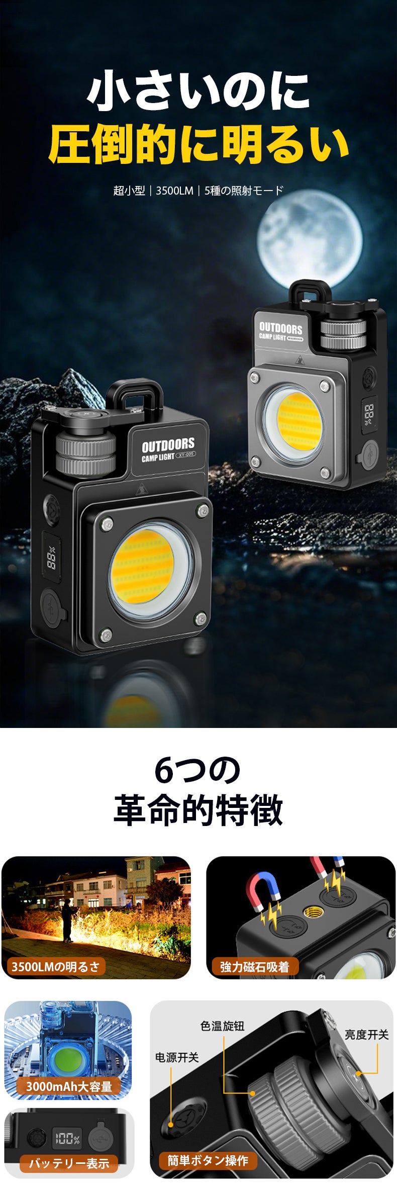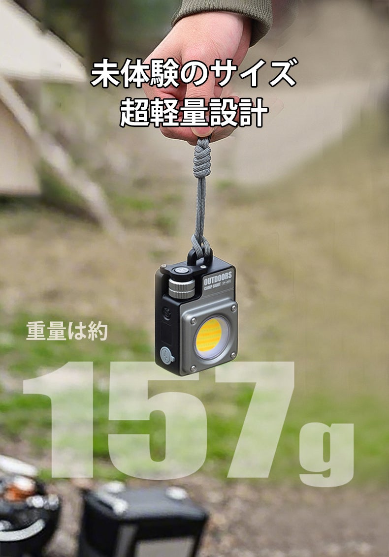 マグネット搭載、三脚対応、吊り下げデザインとなっており、アウトドアや自宅、緊急時など様々なシチュエーションで活躍します。