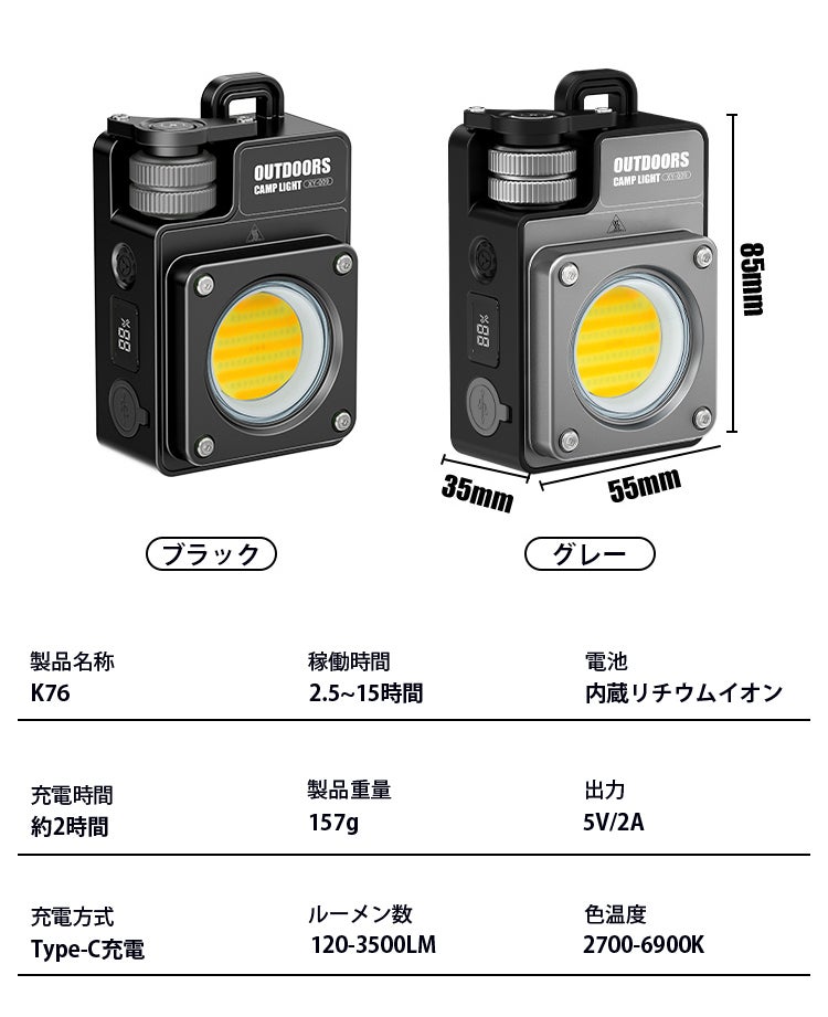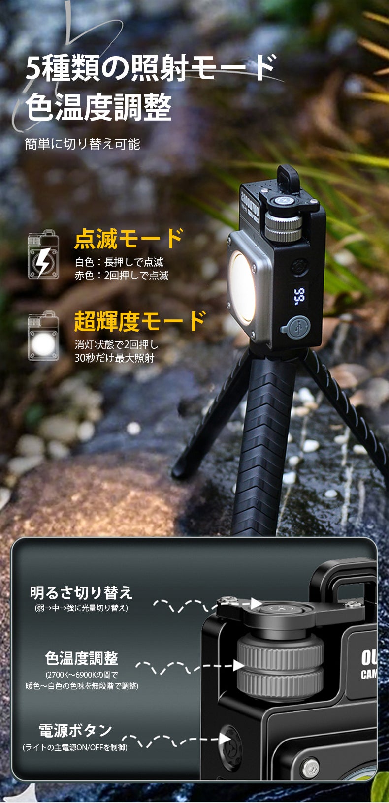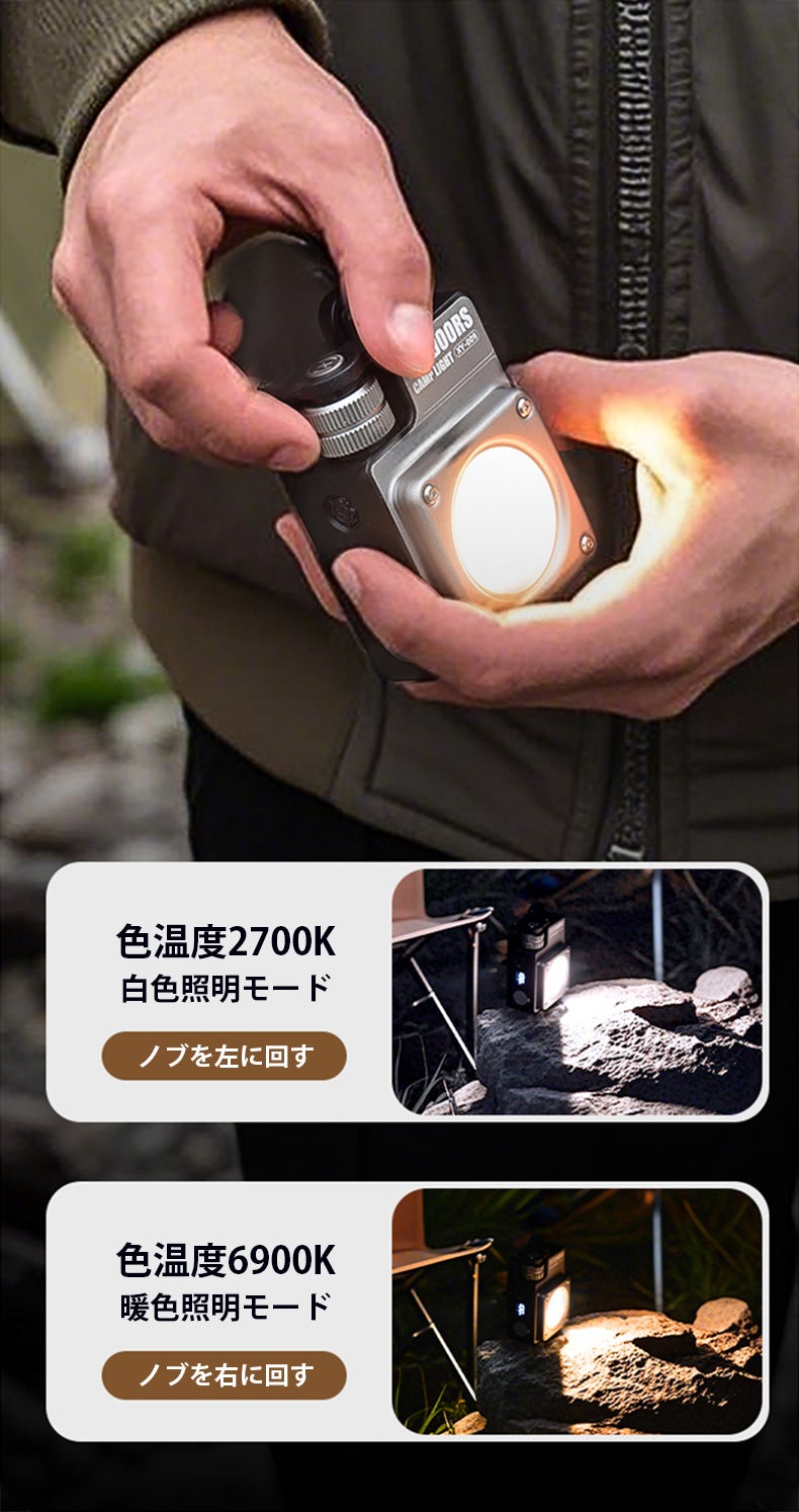 色温度は2700K〜6900Kの間で暖色〜白色の色味を無段階で調整可能なため、キャンプの体験がより快適で多彩になります。