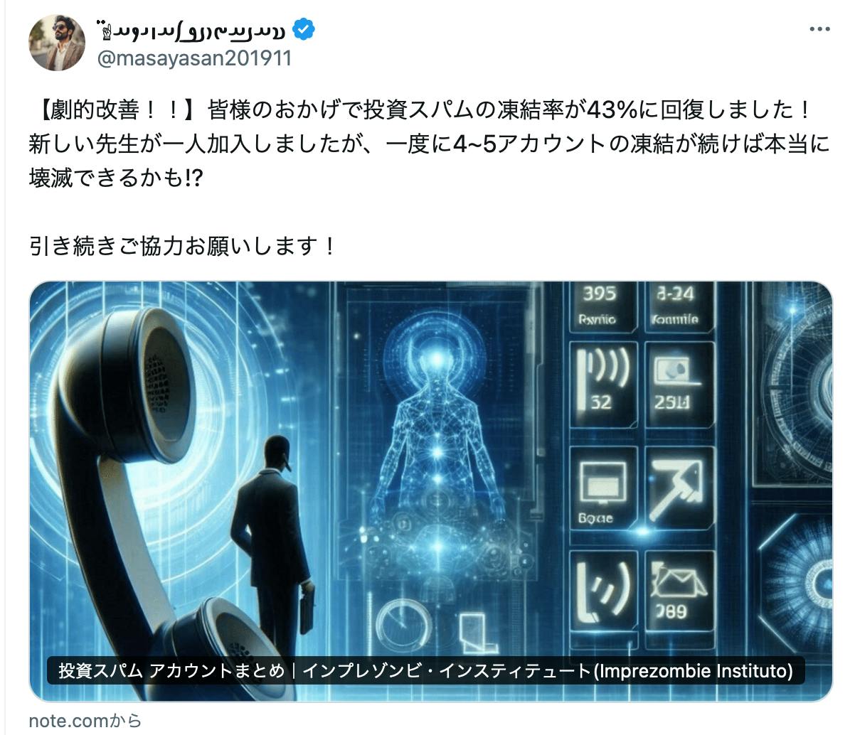 4月19日現在、インターネット上の皆様のご協力もあり、把握している限りで、投資スパムアカウントの凍結率は全体の43%まで進みました。凍結を一気に推し進めたく、このプロジェクトを発案いたしました。