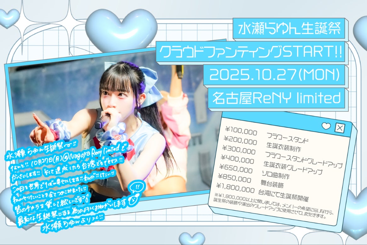2025年10月27日に名古屋NAGOYA ReNY limitedで開催されるアイドル「水瀬らゆん」の生誕祭です。今回は、彼女の生誕祭を成功させるために、彼女を応援する全てのファンの力を集結させたいと考えています。