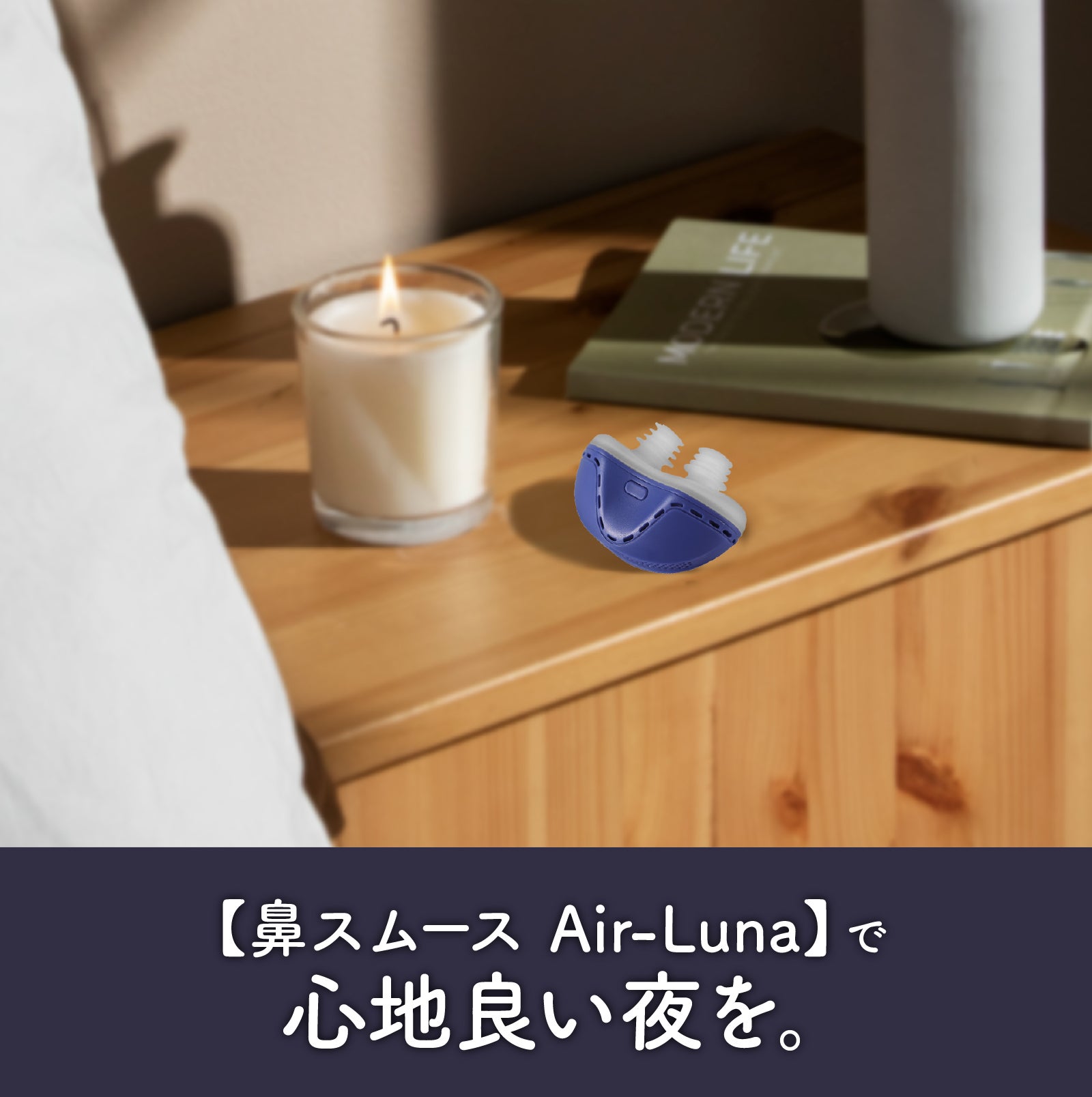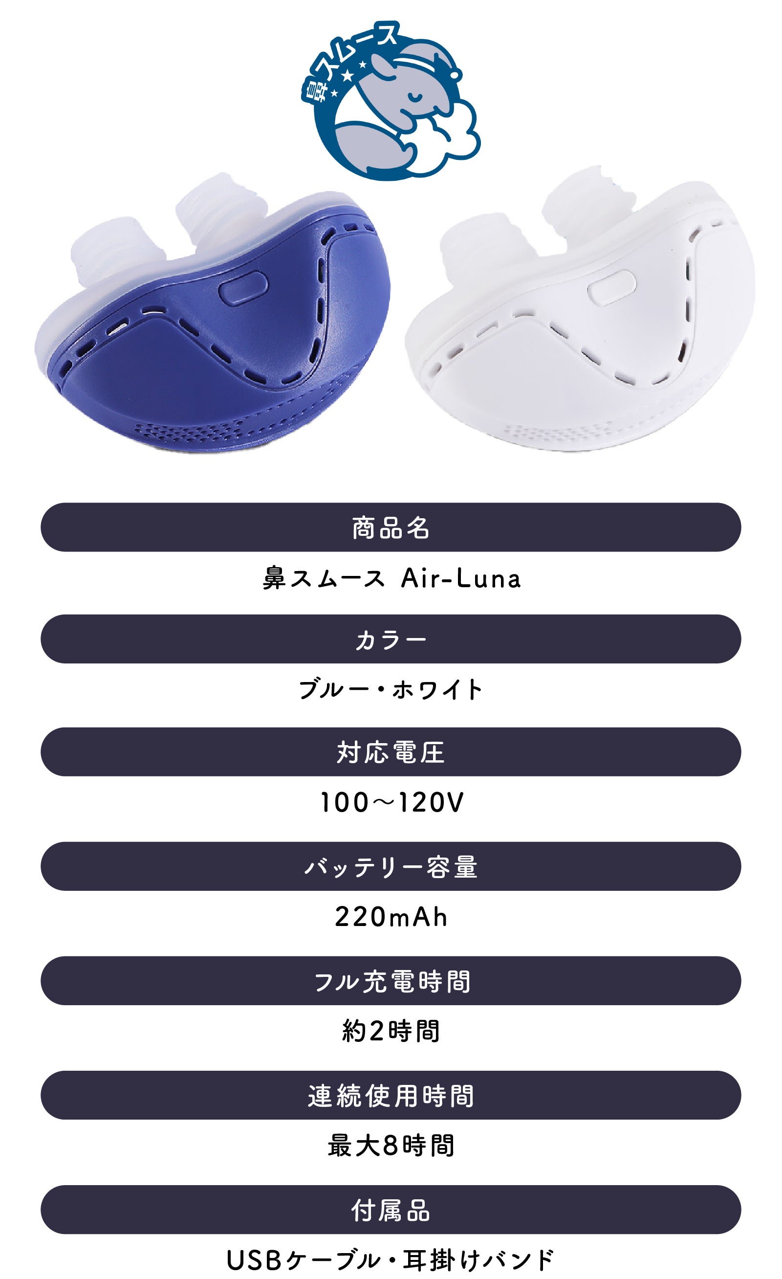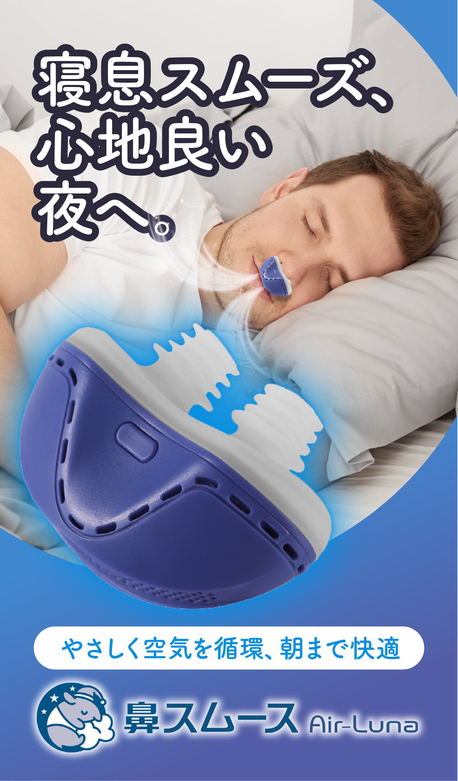 【鼻スムース Air-Luna】は優しく空気を循環し、寝息をスムーズにするおやすみグッズです。