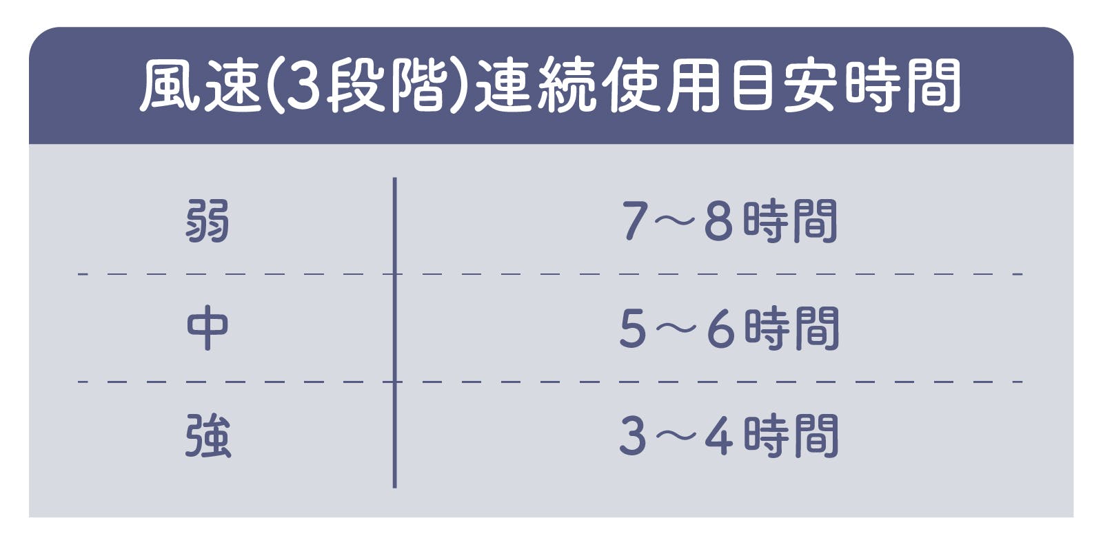 フル充電しておけば最大8時間連続稼働できるので、翌朝までしっかりサポートします。