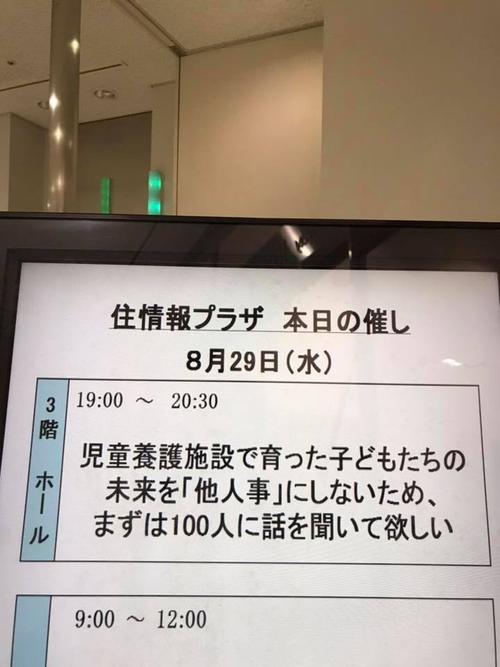 イノベーションドーナツ松本です。 さて、8月31日に無事終了致しました、「児童養護施設で育った子どもの未来を、他人事にしないため、まずは100人に伝えたい」講演会。改めて今回の活動結果と、講演当日のレポートをあわせてお伝えしてみたいと思います。 ーーーー 7月頭から挑戦したクラウドファンディングのプロジェクト、そしてプロジェクト終了後も増え続けたご支援者様の数は、合計70名。当日は、スタッフを除いて36名の方がご来場くださいました。 改めてこの場を借りて御礼申し上げます。 開場は子どもたちも参加してくれて、なんとも賑やかな講演に。 受付嬢も子どもちゃんにお願いしました(笑 そして肝心の講演スタート。 最初は、大阪府立大学 教育福祉学類 教授 伊藤嘉余子氏より「子どもたちの現状について」 続いて、NPO法人merry me's 代表 藤原美奈氏より「児童養護施設を出た子どもたちのために、私たちが出来ること。 心を繋ぐ企業情報誌「ここつな」×職業体験」について おふたりとも1時間半と言う時間で、アツく語ってくださいました。 さて、その中身をどこまでどうレポートしようか…。 実は講演が終わってから私なりに、ずーっと考えていました。でも、なかなかレポート出来ずにおったのは、やっぱり最初にお届けしたいのは、私の言葉なんかじゃないなと、いう思いから。 ずっと児童養護施設を出た子どもたちと向き合い続けてきた、リアルな現場を知るスピーカーのおふたりから、リアルな事実を、直接聞いて欲しい。 これは講演を聞く前から思っていたことなのですが、その思いは講演が終わって尚、強くなりました。 なので今回のレポートでは、おふたりが講演でお話くださった、たくさんの大切なお話の中からほんの一部だけ、中でも松本が印象に残ったお話を印させていただきます。 ーーーーーー 「実家を持たない人生」を歩んでいる子どもたちがいます。“自分には後が無い”、という緊張感の中、生きている子どもたちがいますー伊藤教授 『大人に聞いていいんだ』ということを、知らない子どもたちがいます。なぜなら産まれてきてずっと大人に無視され続け、話を聞いてもらった経験がないから。ー伊藤教授 「自分で産んだ子どもは自分の子、そう思っていた。でも違った。「命」は過去からずーぅっと脈々と紡がれていって、この先何もなければ繋がっていくもので、自分はその過程の1つにすぎない。親は代表なんだと。ー藤原氏 虐待、犯罪…。いろんな理由で「代表」がいなくなった子どもたちは、みんなで育てないといけないんじゃないかと思ったんです、だってみんなの子どもなんだから。ー藤原氏 ーーーーーー これはほんの一部です。1時間半の講演ではもっともっと知って欲しいたくさんの「現実」が語られました。とても哀しくて、ツラくなる現実もありました。でも必ずしも、悲観的になるばかりの後ろ向きな時間では決してなく。 あぁ自分にも出来ることはあるな、と。里親企業として、一個人として少しは力になれるかもしれないな、そう思わせてもらえた一時間半でした。 現在、当日の音声とスライドを動画編集中です。いかんせん手弁当で作業しております、もう少し時間がかかりそうです、しばしお時間くださいね。 お読みくださりありがとうございました。引き続きどうぞよろしくお願いいたします