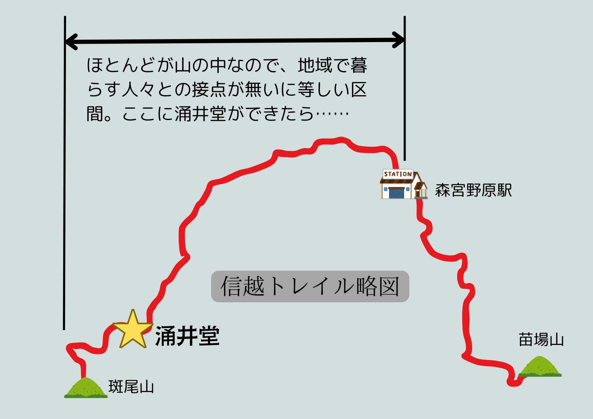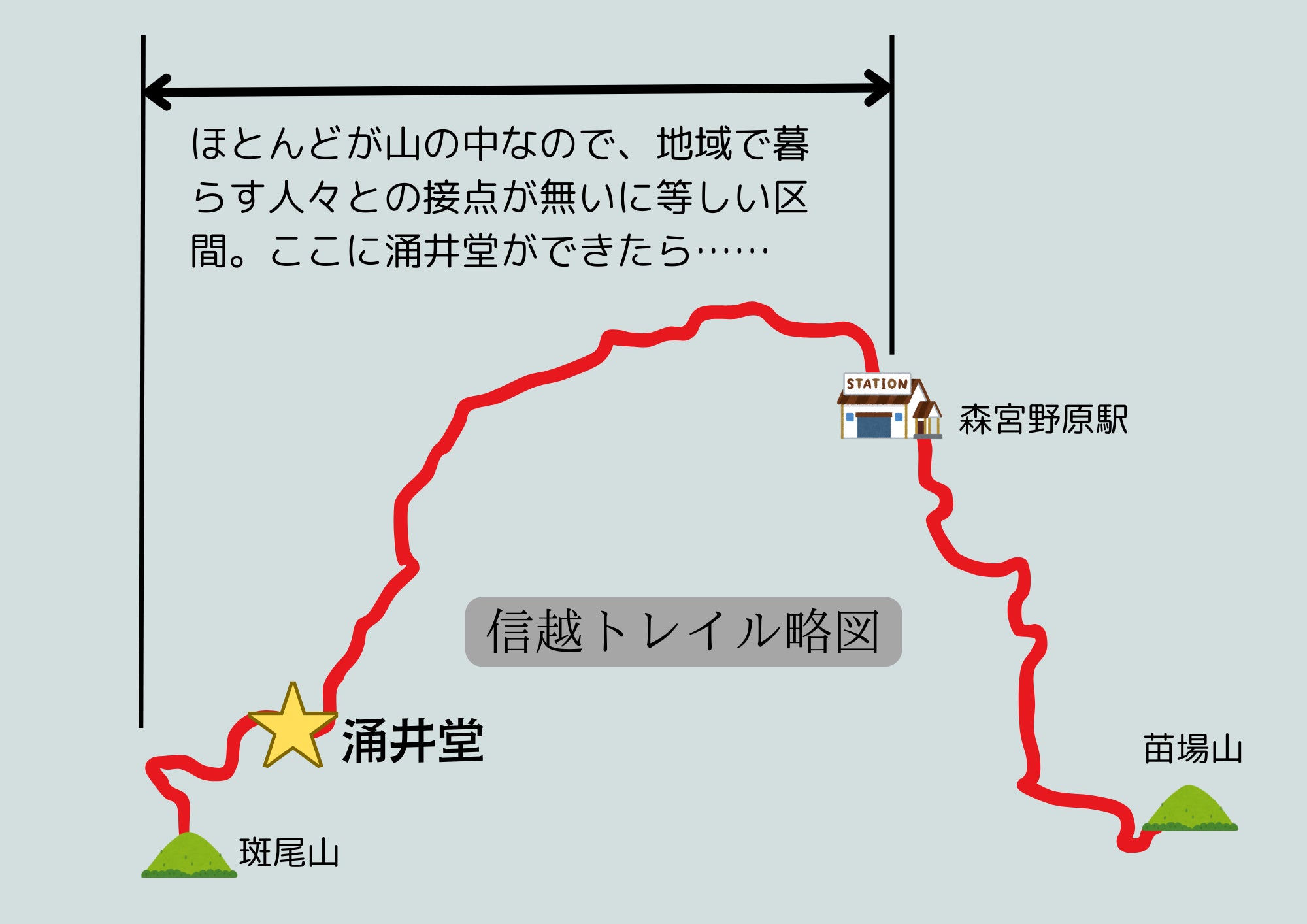 そこで目をつけたのが、信越トレイルのセクション 2 と 3 の境に位置する「涌井」です――なぜなら涌井は信越トレイルと交差する数限られた集落のひとつで、次なる集落(森宮野原駅周辺)までは 3日間ほど歩かねばなりません(ひたすら山の中!)――テントをはじめとした衣食住のすべてを背負って 110km を歩くハイカーが、この涌井集落で水や食糧を補給したり、清潔なトイレを使えたら……そんな着想から「涌井堂」を構想、今回のクラウドファンディングでは、そのトイレに的を絞ってご協力をお願いすることにしました。詳しいストーリーは、発起人の note マガジン『里山の駅・涌井堂』をご覧ください。