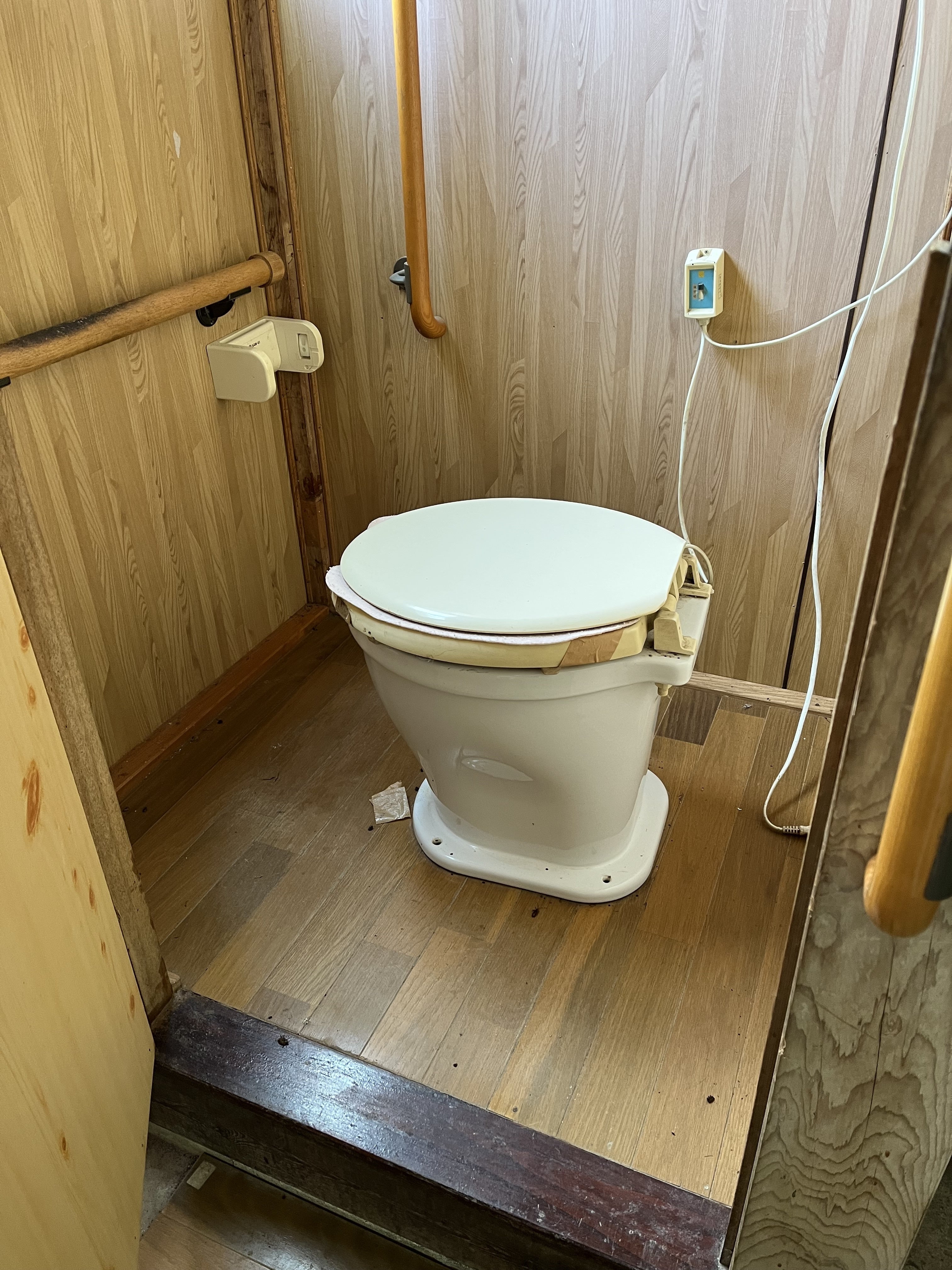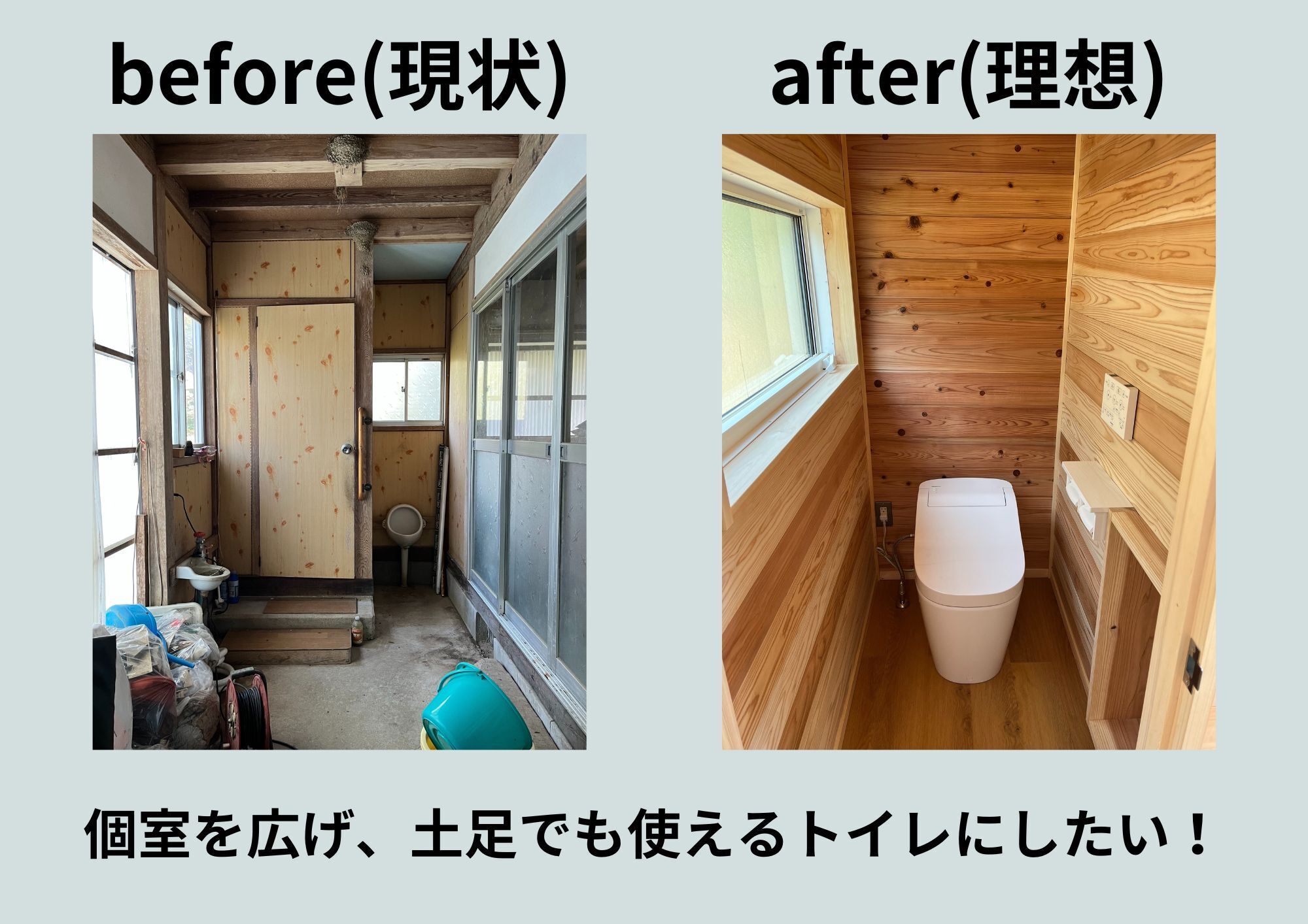 ちなみに “ボットン便所” とは、便器と便槽(タンク)が直結しているトイレのこと。つまり、便器の穴を覗けば便が見える、という代物です。まずこの便器を「簡易水洗」に交換し、水洗トイレに近い感覚でお使いいただけるようにします。また、現状は “一般家庭のトイレ” なので、土足で気兼ねなく利用できるよう工事します。