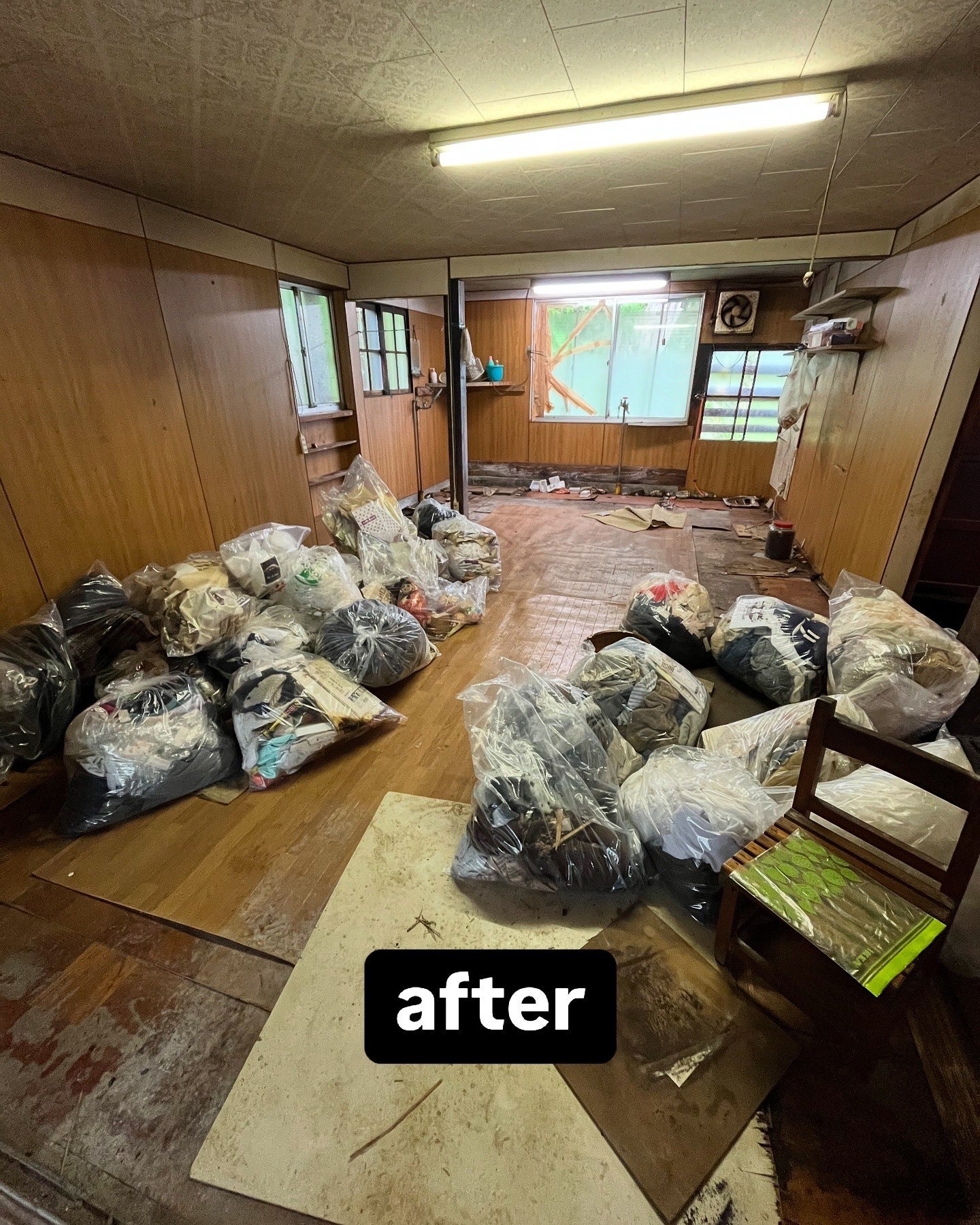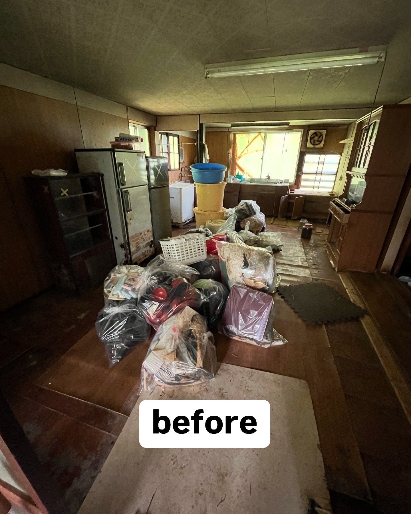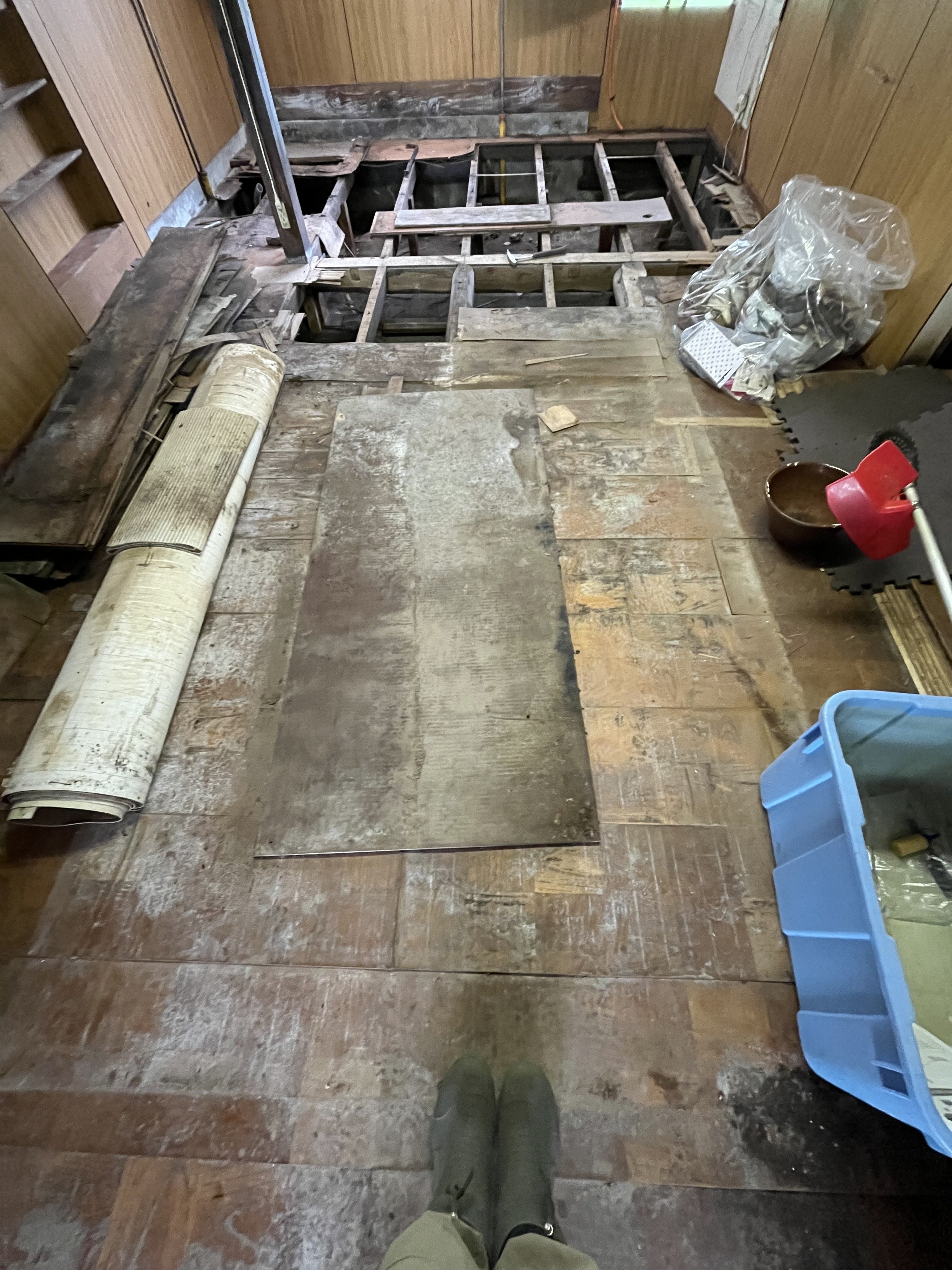 先日、助っ人の力を借りて、冷蔵庫や食器棚、タンスなどといった “大物” を片付けました。そしてようやく、台所の床を剥がし始めることができました。湿気のせいもあり床がベコベコなので、最優先で修繕したいのです(居住部分については、自費および DIY で行っています)。