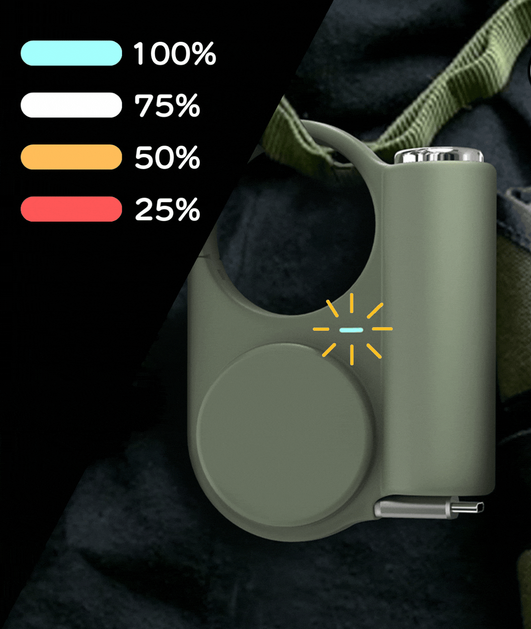 フック付きデザインだから、バッグやベルト、リュックにサッと引っ掛けるだけで、スマートに充電可能。