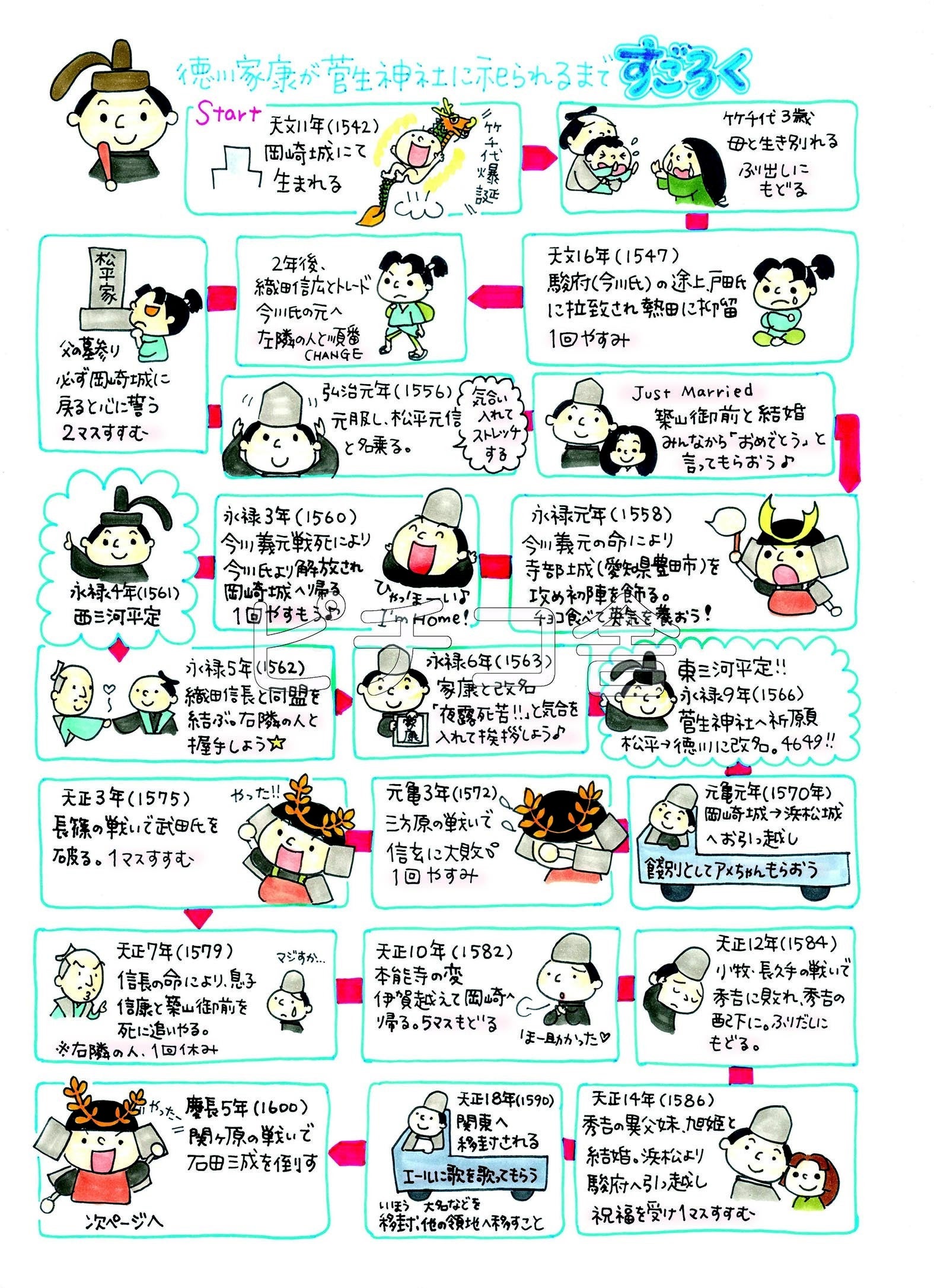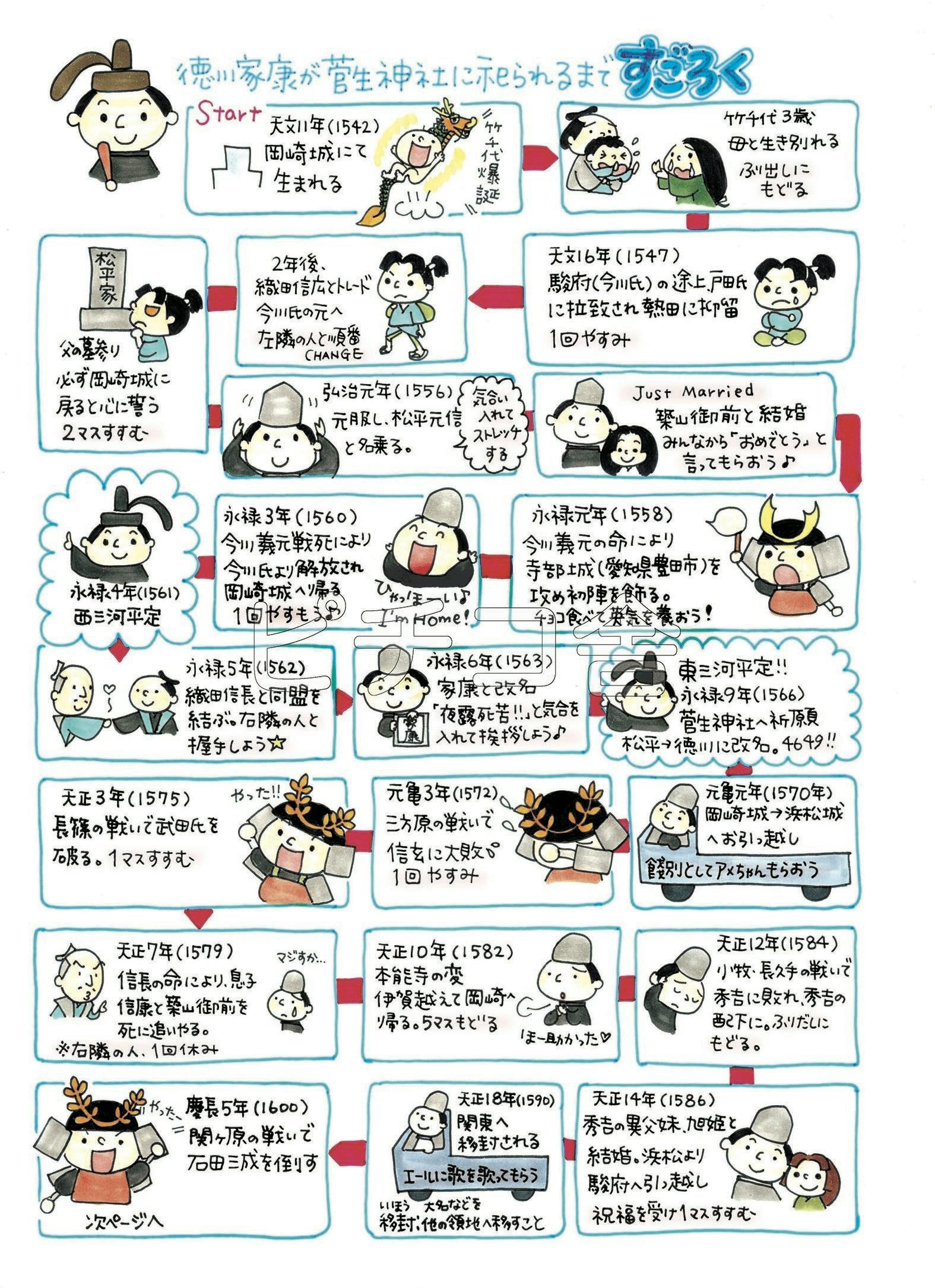愛知県岡崎市の菅生神社のレポートより。岡崎市は徳川家康公ゆかりの地。改めて家康公が祀られるまでの人生をすごろくで表現してみました。他にも武田信玄のお屋敷跡に鎮座する武田神社もレポートしており、戦国時代の混乱期もだいぶ理解できました。