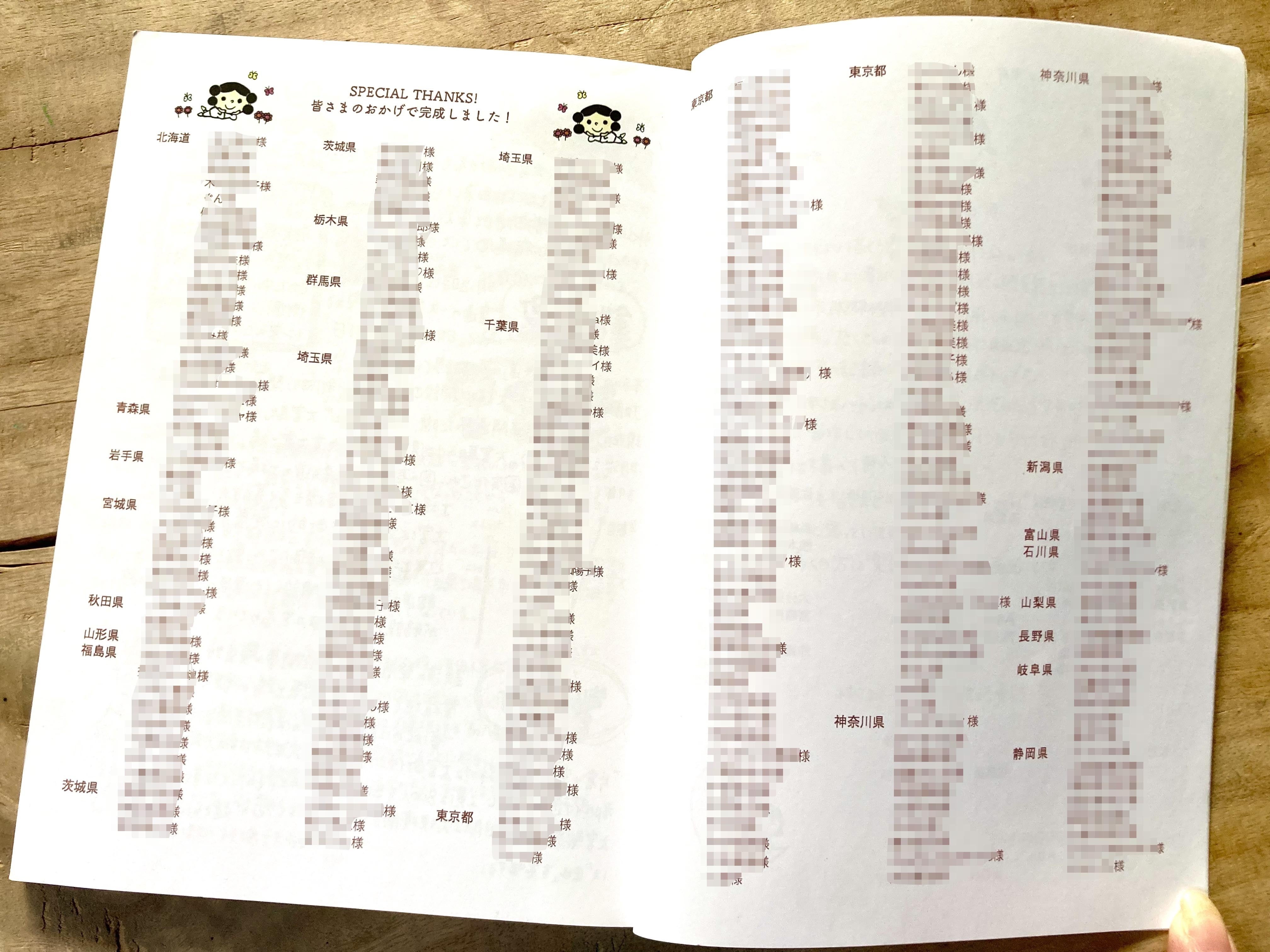 (神さまノート4の巻末ページ。巻数を重ねるごとに多くの方からのご支援いただき、神さまノート4では見開き4ページに渡って掲載しております。本当にありがとうございます。)※備考欄へご希望のお名前の記入をお願いいたします。(無記入の場合、実名を掲載いたします。)