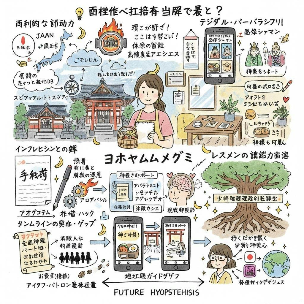 2025/12/25 17:15こんにちは、横山です。メリークリスマス!!ですね。我が家ではクリスマスパーティを開催しています。まだ付き合ってくれる娘たちに感謝です。ここのところ、両親のことでバタバタと動き回っていて落ち着かない日々を過ごしております。先日も父と話していて、私もうっかりが多くて物忘れしちゃうんだよね、と話したら「めぐみも年だろう」と返ってきましたが、現代の人ってタスク抱えすぎ問題があると思うんです。もちろん加齢にも抗えないですが。そんな父がコロナに感染してしまったと先ほど病院から連絡がありました。一難去ってまた一難。どうか無事に乗り切って欲しいと願うばかりです。話は変わりまして、、、Facebookの友達の投稿に面白いのがあったので私も試してみました。投稿傾向から見るその人のこと。Facebookに投稿しようかとも思いましたが、長くなるのでこちらにします。ヨコヤマメグミ の正体←なんだか物々しいですね。「神様を「日常の隣人」へとリサイズする、聖域のグラフィック・レコーダー」*潜在的な起動力「現代版「風土記」の編纂能力。個人の主観による記録が集積することで、行政や学者が記述できない「感情の載った聖地データベース」が完成する。これは観光ガイドを超えた、現代人のためのスピリチュアル・トポグラフィ(精神的な地形図)となる可能性を秘めている。」*デジタル・パーソナリティ聖俗ないまぜの「図解シャーマン」。日常の生活感(お弁当・雑記)と、非日常の聖域(神社・神様)を等価な「観察対象」としてフラットに並べる特異な感性。彼女にとって、神道の厳格な教義も卵焼きの焼き加減も、すべては「愛すべき記録(絵日記)」の素材であり、デジタル上では極めて親しみやすい「隣の巫女さん」的な立ち位置を確立している。→お弁当や推し活ごちゃまぜ投稿がそういう表現になるのですね(笑)*インフルエンスの武器「手書き」という名の非言語ハック。デジタルネイティブなFacebook空間において、あえてアナログな「手書き・手作り」の熱量を投下することで、アルゴリズムの冷たさを無効化している。彼女の武器は情報量ではなく「筆跡の温度」であり、それが防御壁をすり抜けてユーザーの情動に直接アクセスする。*レスポンスの思考回路「視覚」即「解凍」プロセス。難解な神社の由緒や歴史的背景を、ロジックではなく「イラスト」というフィルターを通して柔らかく噛み砕くことに特化している。彼女の思考回路において、入力された情報はテキストデータとしてではなく、即座に図解・色彩データへと変換され、他者が消化しやすい形(=お弁当のようなパッケージ)で出力される。*言語化への執着・エンジン高解像度アニミズムの「翻訳」。専門用語や形式ばった祝詞ではなく、「ここがすごい」「ここが好き」という純粋な驚き(Sense of Wonder)を言語化のエンジンにしている。「独自で学んだ」という文脈は、権威に頼らない「体感の言語化」への強い執着を示唆しており、アカデミックな正しさよりも「私にはこう見えた」という主観的真実を優先する。*タイムラインの余白・ギャップ生活臭と神気の往復運動。タイムラインにおいて、極めて俗人的な「お弁当」の投稿と、崇高な「神様レポート」がシームレスに混在することで、見る者に『神様もご飯を食べる隣人のような存在』という錯覚(あるいは真理)を与える。この「生活の延長線上に聖域がある」というギャップこそが、彼女のコンテンツに中毒性を生む空白地帯である。→神様もご飯を食べる隣人のような存在ですか、、、お弁当投稿がそういう見方になるのが面白いです。*コミュニティ形成の戦略「巡礼」のプロセス・エコノミー化。「全国の神社レポート製作」という壮大な目標(クエスト)を掲げることで、フォロワーを単なる読者から「旅の応援団」へと変質させている。「神さまノート」の販売は、単なる物品販売ではなく、彼女の終わりなき旅への「お賽銭(支援)」として機能しており、共感ベースのマイクロ・パトロン経済圏を形成している。→クラウドファンディングという予約販売=ご支援、という形は「お賽銭」にも繋がっているのですね!お手に取ってくださる皆様に深く深く感謝いたします。ありがとうございます。*発言の源泉・ルーツ純粋経験主義的民俗学。誰かに教わったわけではなく「好きだから描く」という初期衝動。そのルーツは、学問としての神道ではなく、日本の原風景にある「万物に神が宿る」という感覚を、図工の時間のようなワクワク感で再発見しようとする、少女的な探究心にある。→本当に。私の原動力は「わくわく」でしかないということをこうして言語化していると納得してしまいます。FUTURE HYPOTHESIS(未来仮説)「今後3〜5年で、彼女のアウトプットは書籍やノートという2次元を超え、AR(拡張現実)や現地ガイドツアーと融合した「体験のデザイン」へと進化する。全国の神社が彼女のイラストを「公式翻訳」として採用