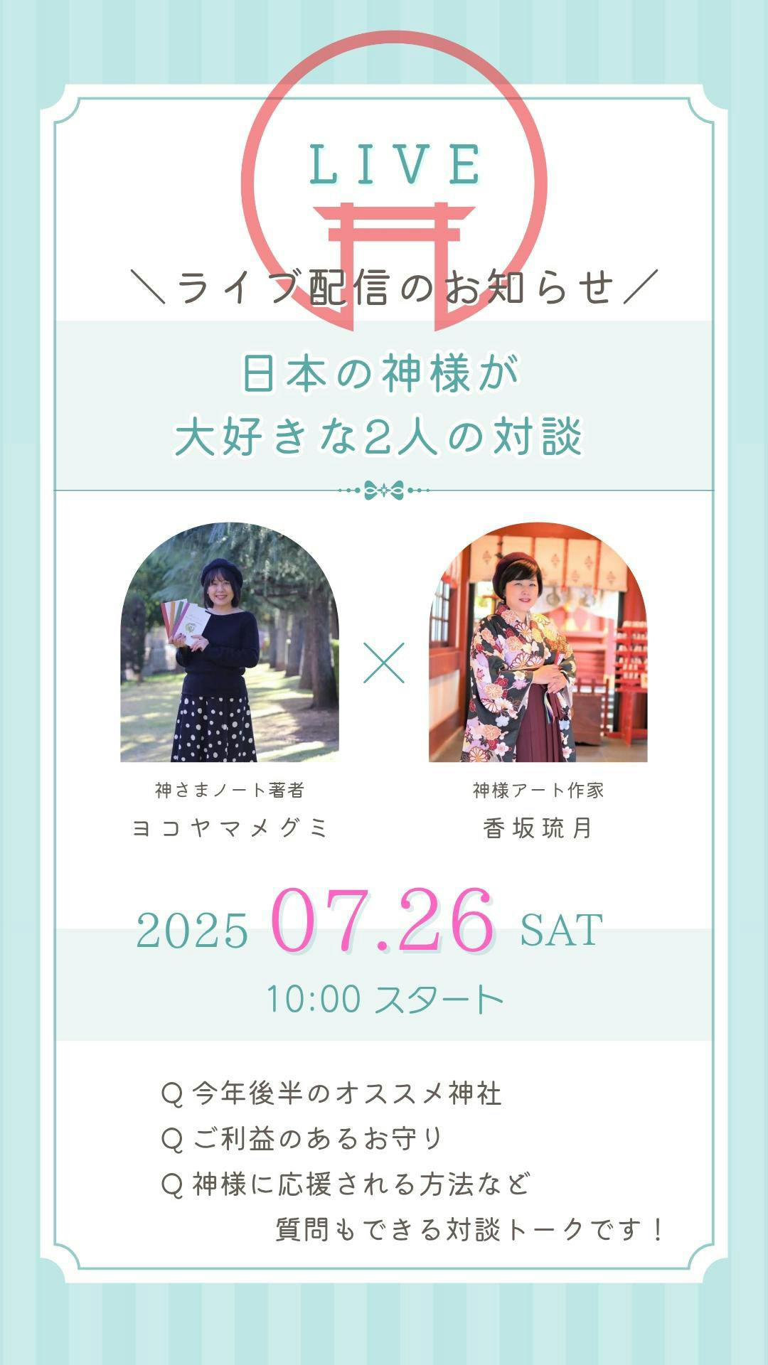 お互いの活動のことはもちろんですが、それぞれのおすすめ神社などお話ししたいと思っております。